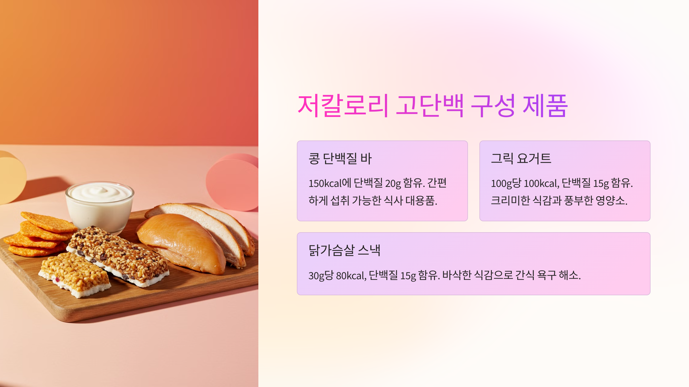 🍽️ 다이어트할 때 제일 중요한 건 적절한 열량 제한과 함께 근손실 없는 고단백 식사예요. 칼로리는 낮고 단백질은 풍부한 제품이 필요하죠!