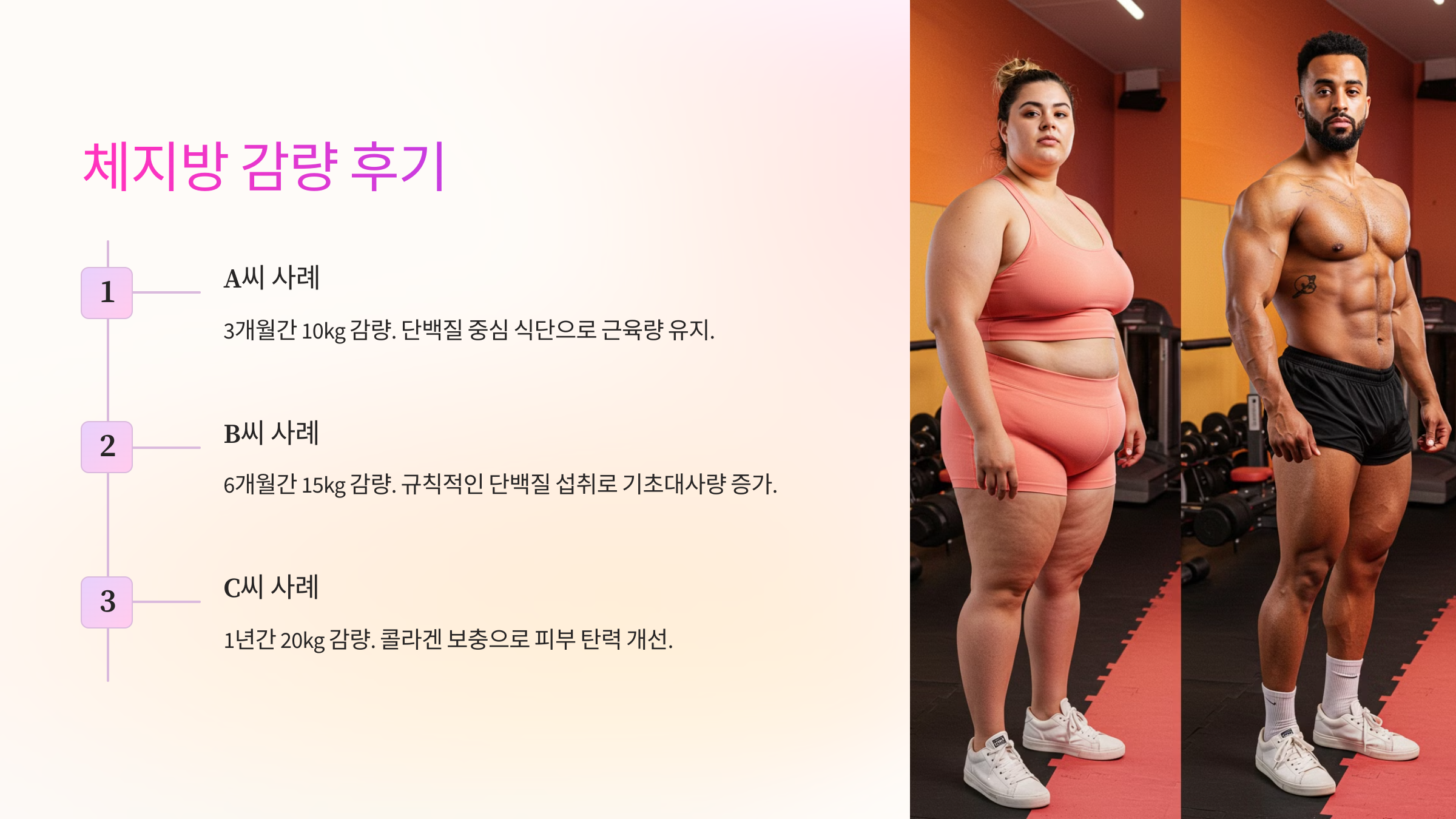 📊 이들의 공통점은? 무리한 굶기 없이, 단백질로 식사 구성 개선을 했다는 거예요. 건강한 감량 = 영양을 충분히 채워주면서 활동량을 늘리는 게 정답이랍니다!
