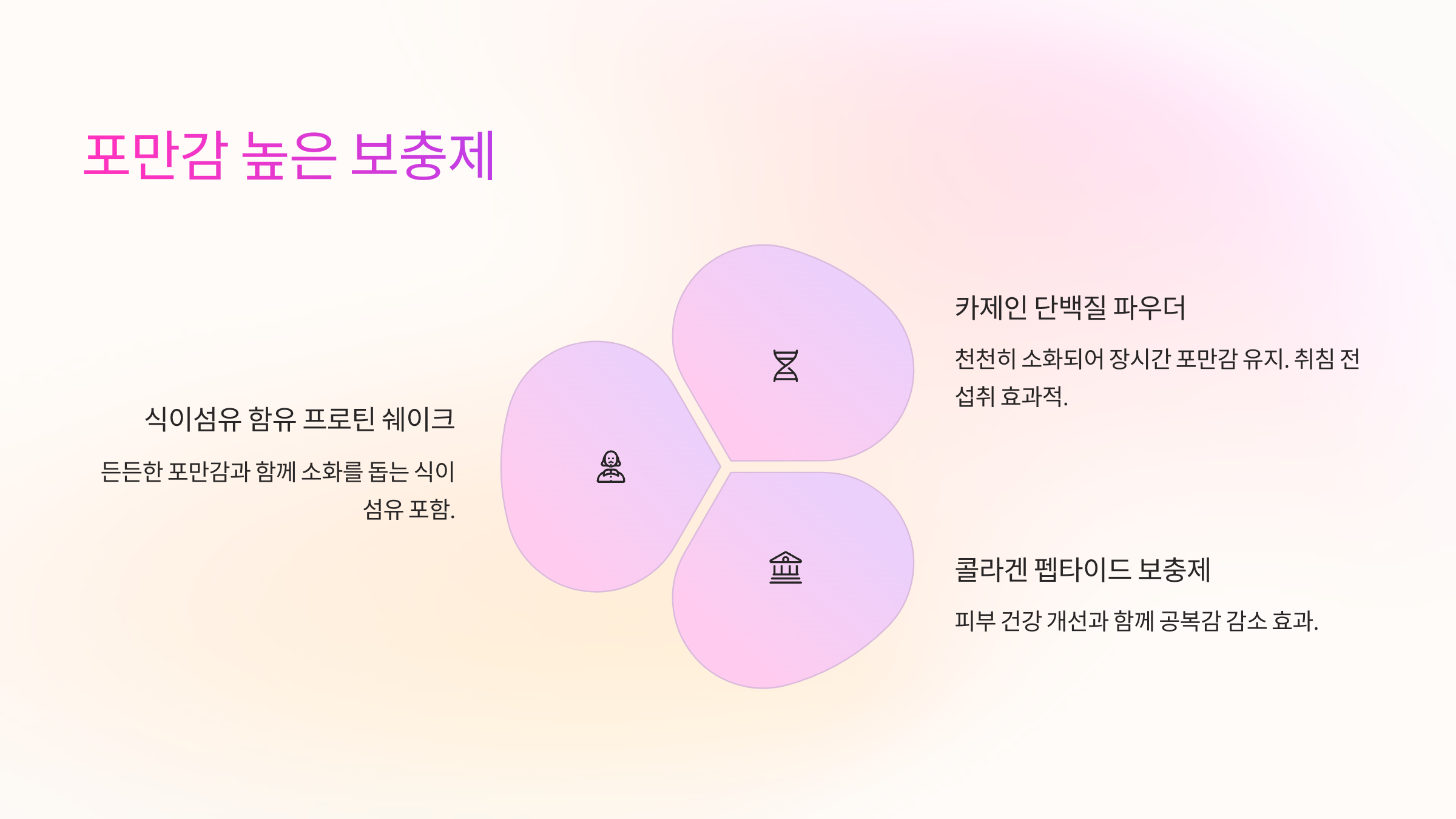📦 포만감을 주는 보충제는 단백질 외에도 식이섬유, 귀리, 치아씨드, MCT 오일 같은 성분이 들어 있어요. 이런 재료들이 소화 속도를 늦추고 속을 든든하게 만들어줘요.