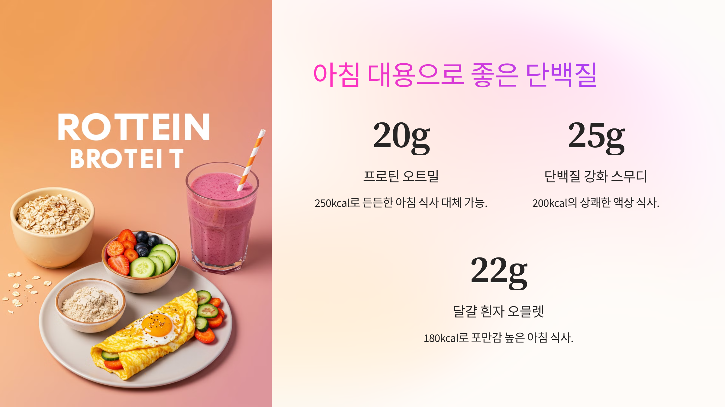 💡 포인트는 아침 식사 대용으로는 단백질 + 복합 탄수화물 + 식이섬유를 함께 포함한 제품을 고르는 거예요. 단백질만 있는 제품은 배고픔이 금방 올 수 있어요.
