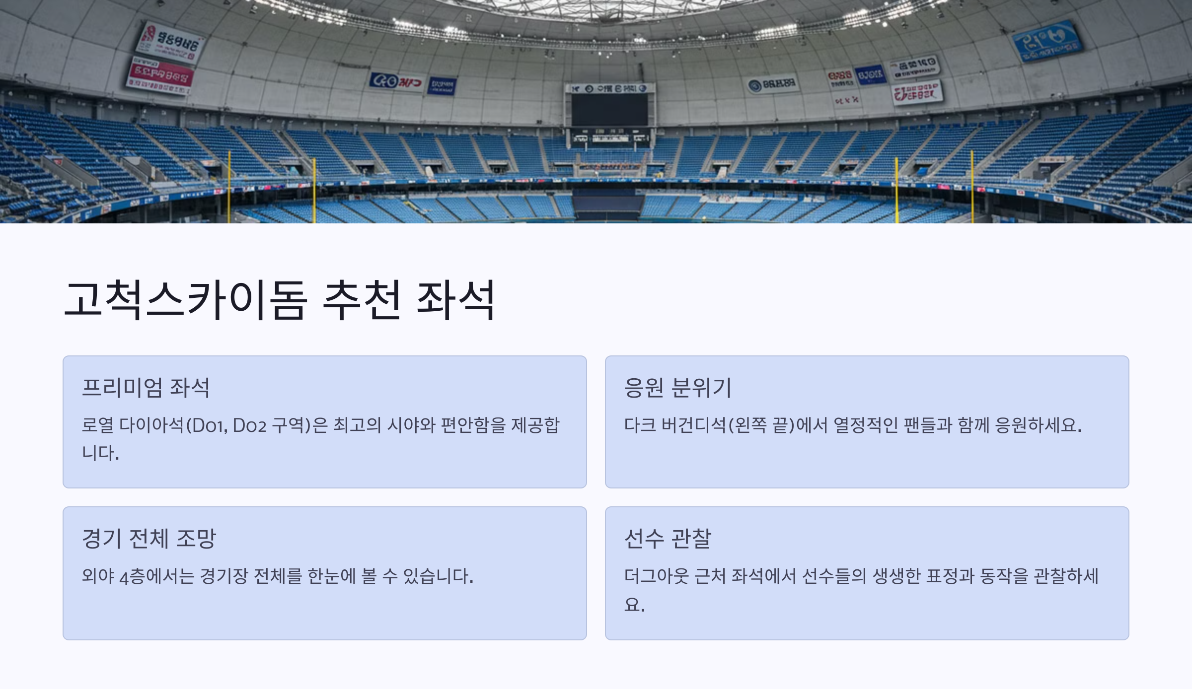 | 중앙지정석 | 시야 안정, 정면 경기 관람 | 초보 관람객, 커플 |