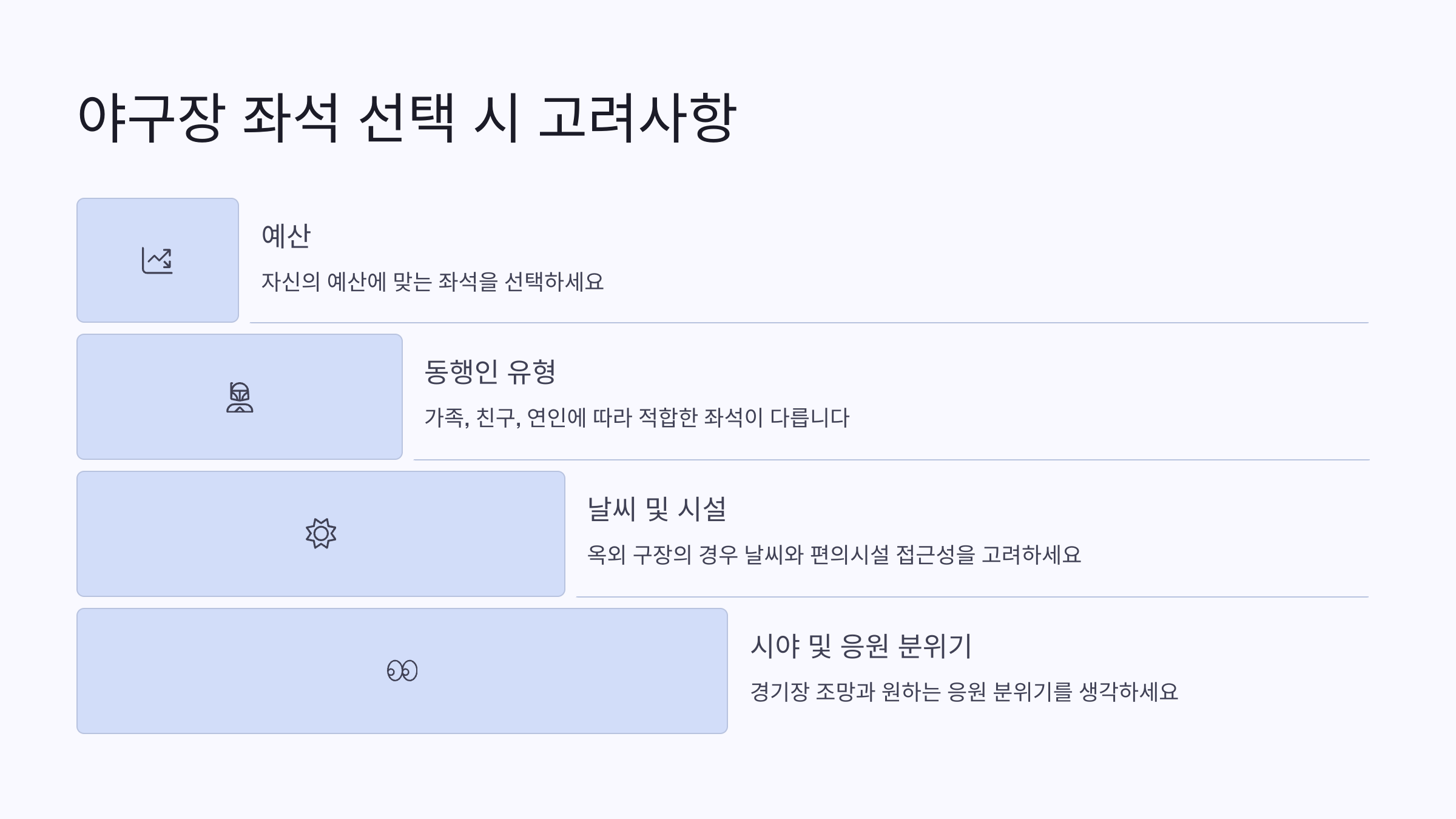 A8. 예매 전 구장 구조도를 꼭 확인하고, 좌석 시야 후기를 검색해보세요. 응원 중시, 조용한 관람, 가족용… 목적에 따라 다르게 선택하는 게 꿀팁이에요 🧠