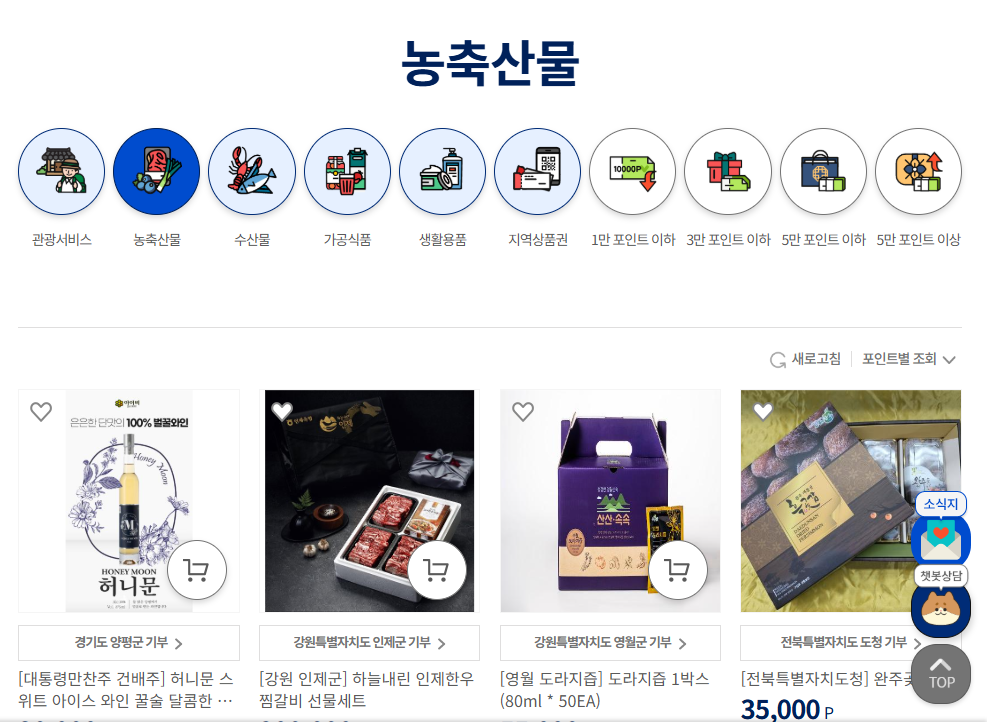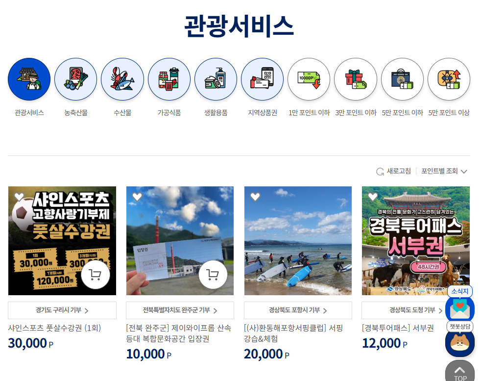 - 기타 상품: 지역 특산주, 공예품, 관광 상품권 등