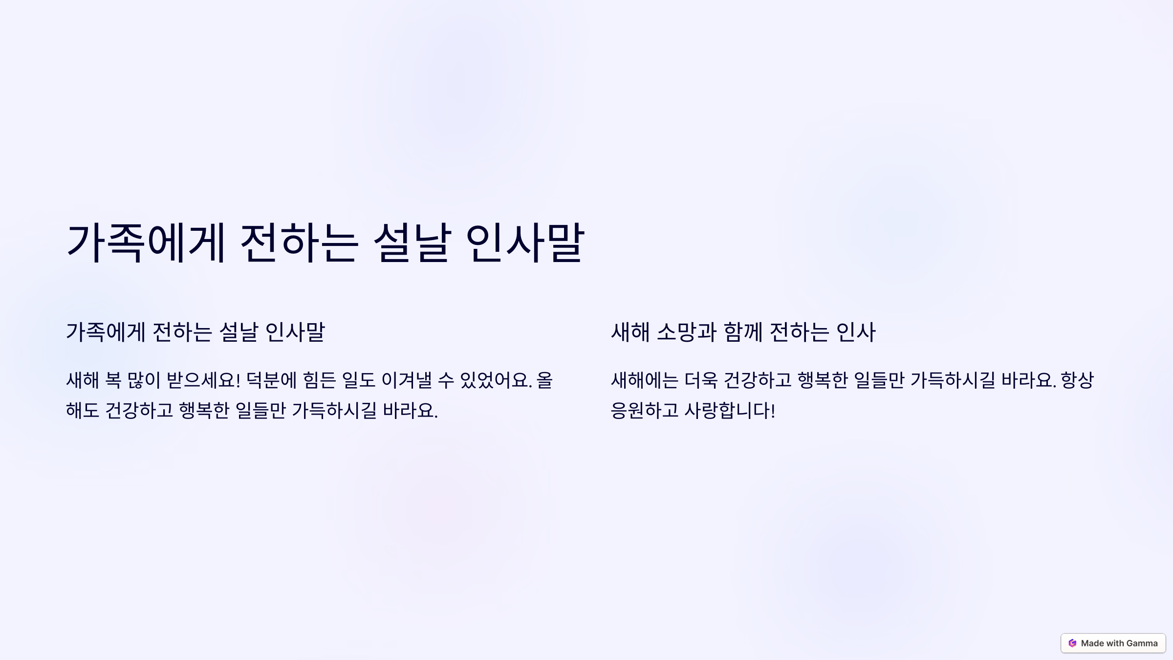 - "엄마, 아빠 설날 잘 보내세요! 올 한 해도 건강하시고 행복한 일들만 가득하시길 바라요. 사랑합니다. ❤️"