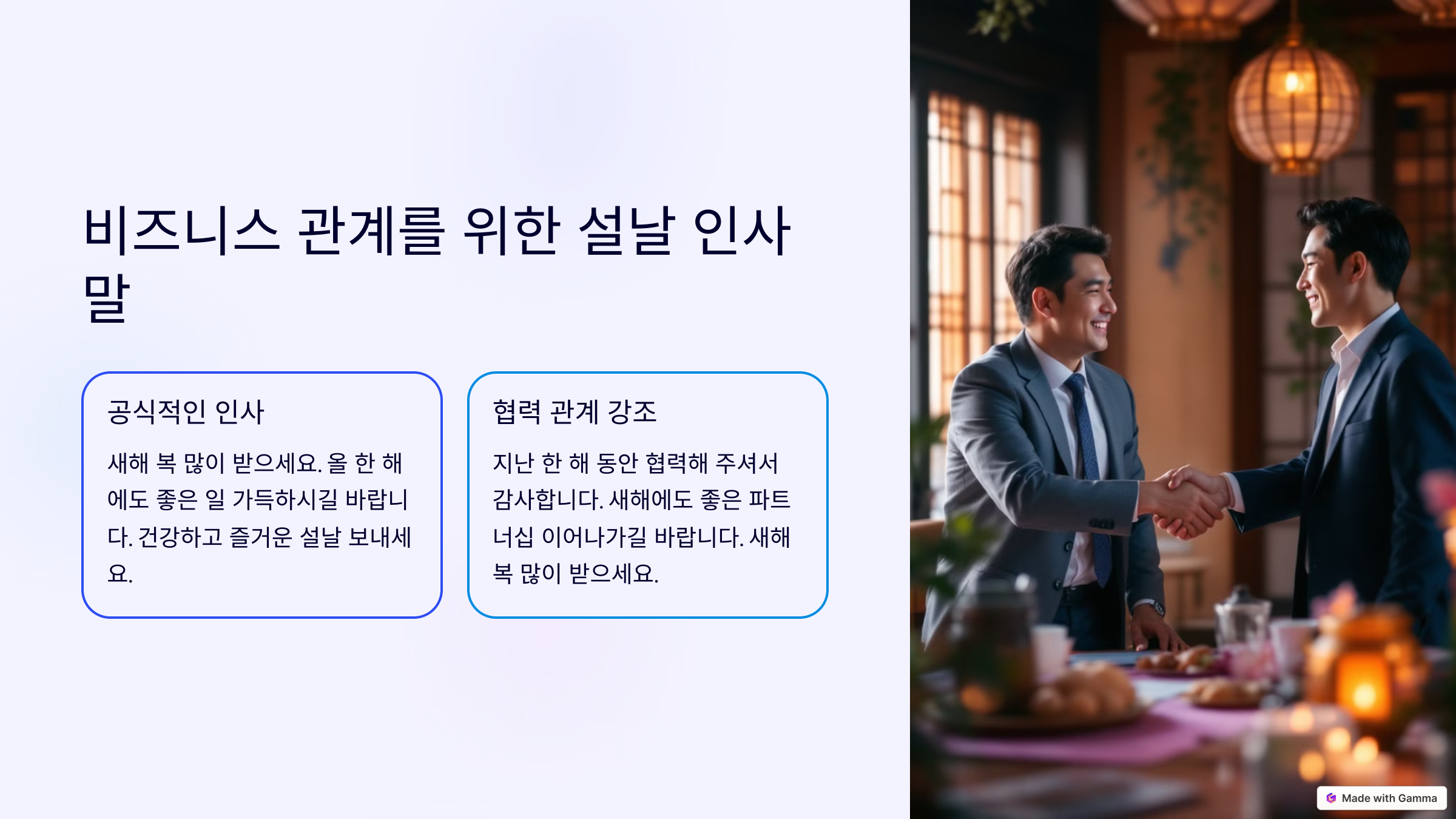 비즈니스 메시지는 짧더라도 진심과 예의를 담아야 합니다. 회사 연하장, 이메일, 또는 문자로 전달하기에 적합합니다.
