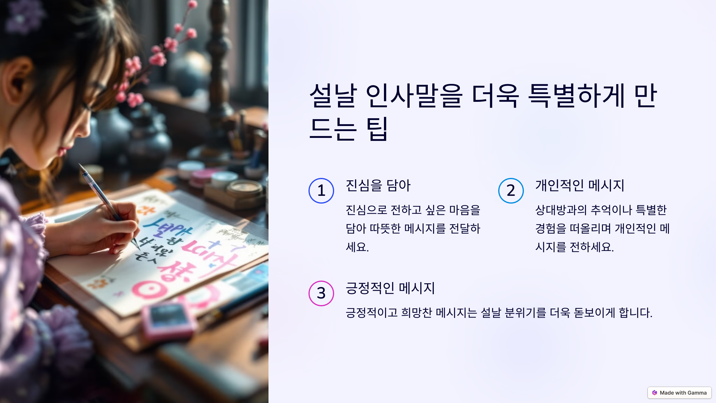 설날 인사말과 함께 작은 선물을 전달하면 인사말이 더 큰 의미를 가질 수 있습니다. 간단한 떡 세트나 핸드메이드 아이템도 좋습니다. - 음성 메시지 활용하기