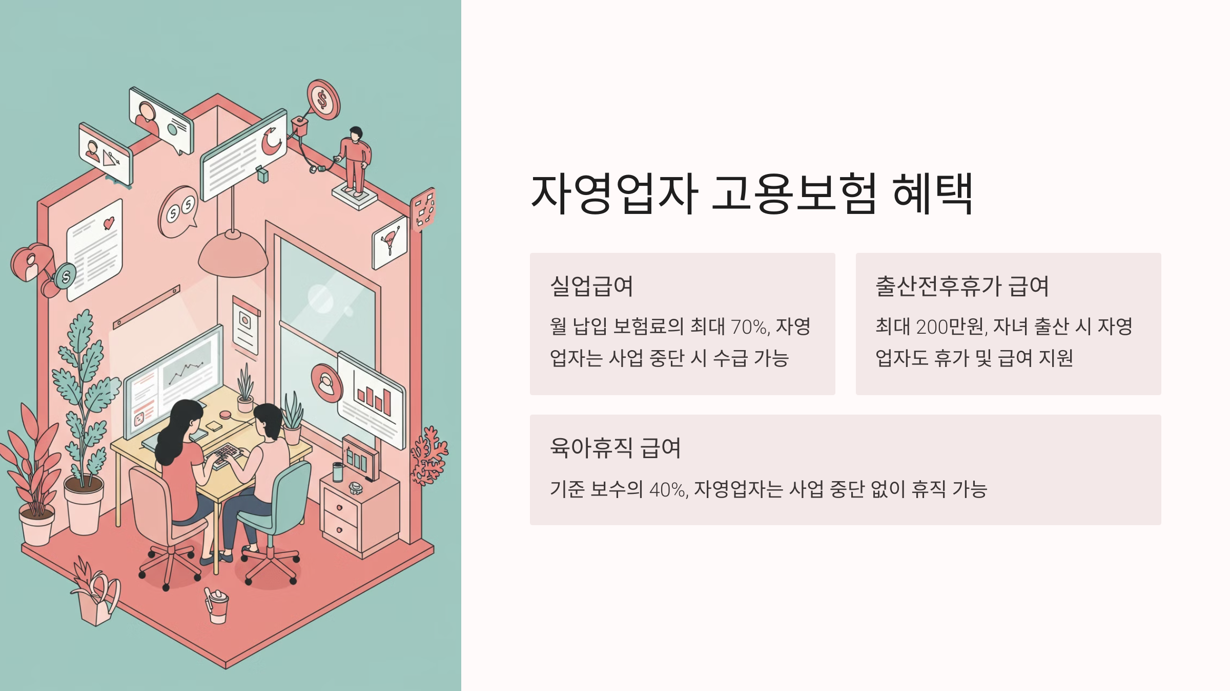 자영업자 고용보험은 가입이 선택적이기 때문에 스스로 가입해야 해요. 하지만 가입 후 일정 요건을 충족하면 실업급여뿐만 아니라 출산급여, 폐업 지원금 등 다양한 혜택을 받을 수 있어요!