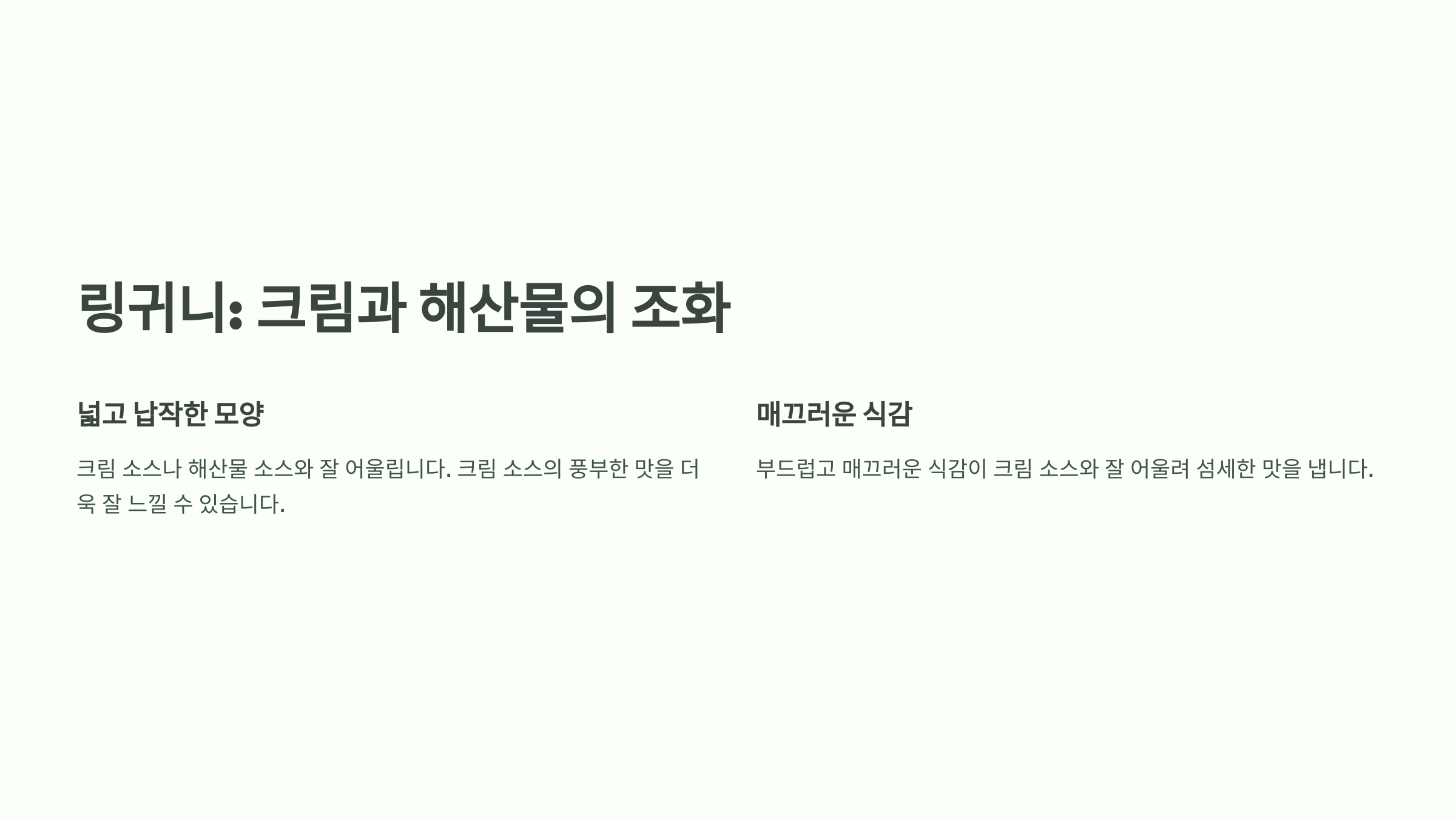 - 링귀니는 납작한 형태로 크림소스와 잘 어울리며, 스파게티는 둥근 모양으로 거의 모든 소스와 어울립니다.
