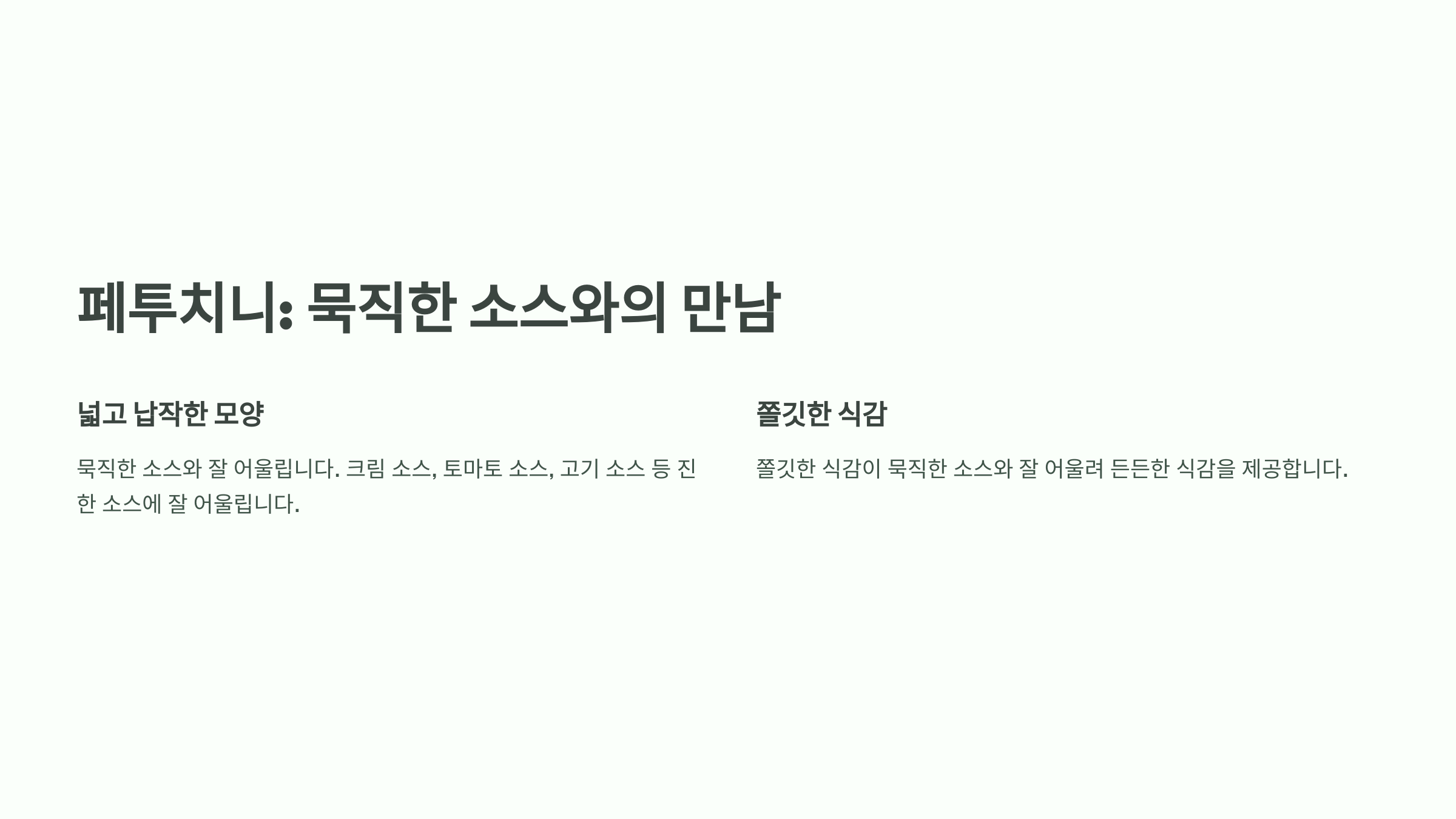 페투치니는 폭이 넓고 납작한 면으로, 묵직하고 진한 소스와 궁합이 뛰어납니다. 크림소스의 대명사인 알프레도 소스나 고기소스와 함께 요리할 때 그 진가를 발휘합니다.
