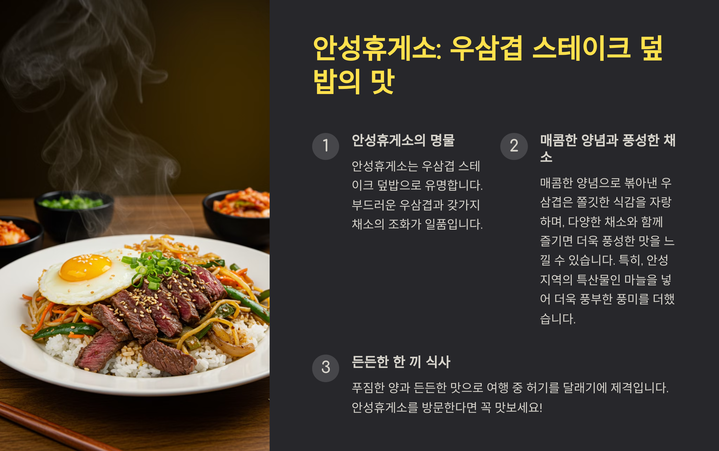 안성휴게소는 경부고속도로를 이용하는 사람들이라면 한 번쯤 들러봤을 정도로 유명합니다. 이곳의 대표 메뉴는 우삼겹 스테이크 덮밥인데, 높은 퀄리티의 고기를 사용하여 그 맛이 고급 레스토랑 부럽지 않을 정도입니다. 우삼겹이 갖는 고소함과 특제 소스가 완벽히 어우러져 든든한 한 끼를 제공합니다.