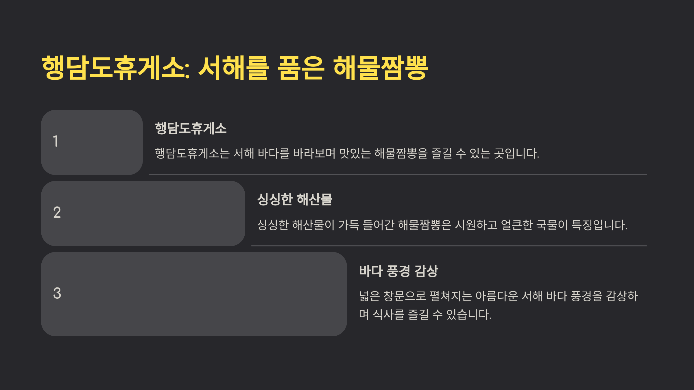 행담도휴게소는 서해대교를 지나는 길목에 위치한 곳으로, 그 독특한 위치만으로도 많은 사람들에게 사랑받는 장소입니다. 하지만 이곳이 더욱 주목받는 이유는 바로 해물짬뽕입니다. 신선한 해산물로 우려낸 진한 국물과 쫄깃한 면발이 어우러져 특별한 맛을 선사합니다.