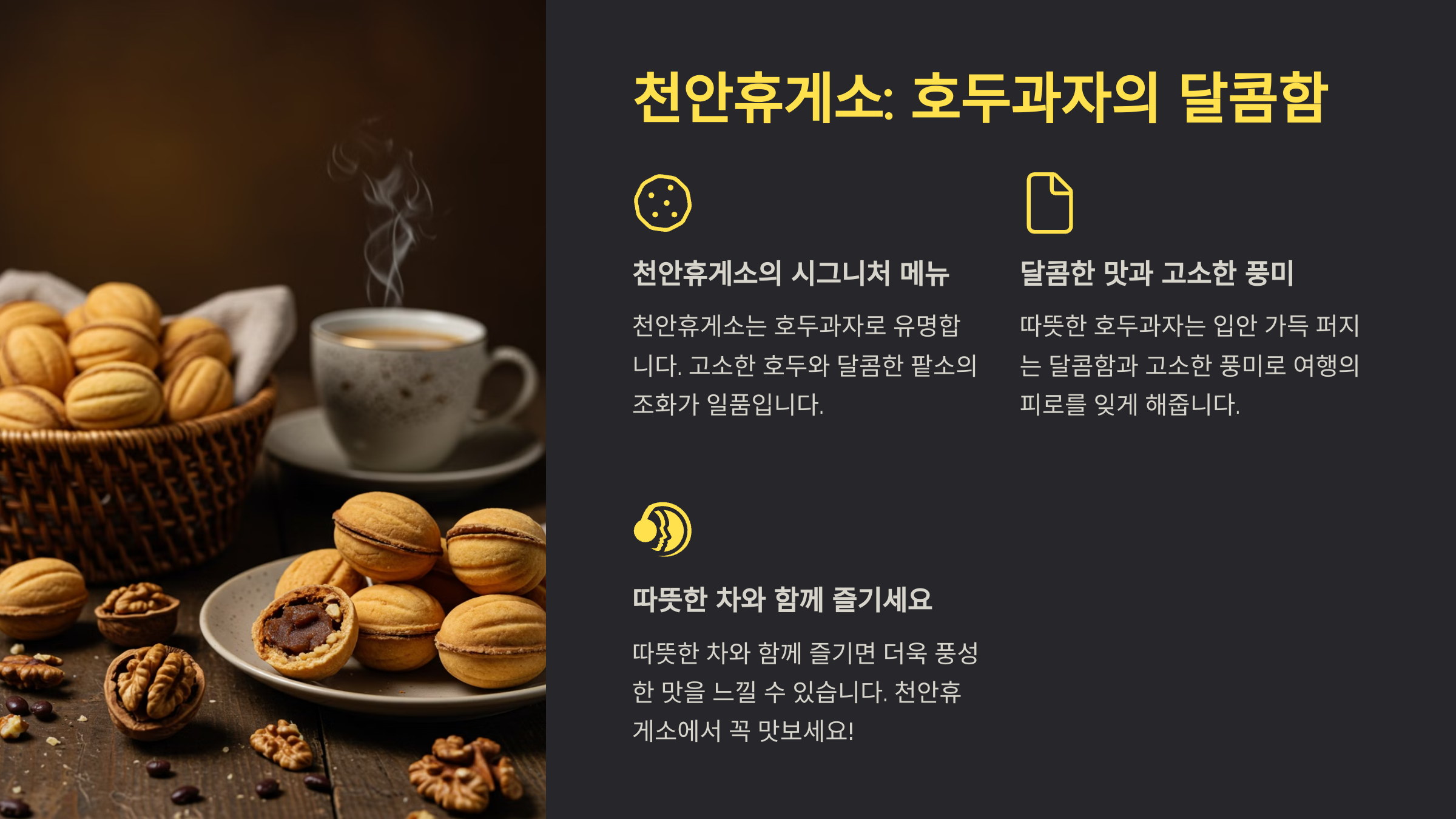 천안하면 떠오르는 대표적인 먹거리는 바로 호두과자입니다. 천안휴게소에서는 갓 구운 호두과자를 맛볼 수 있어 여행 중간에 간단히 즐기기 좋은 디저트로 제격입니다. 특히 이곳의 호두과자는 일반적인 호두과자보다 크기가 크고, 필링도 더 풍부해 단순한 간식을 넘어 작은 디저트로 손색이 없습니다.