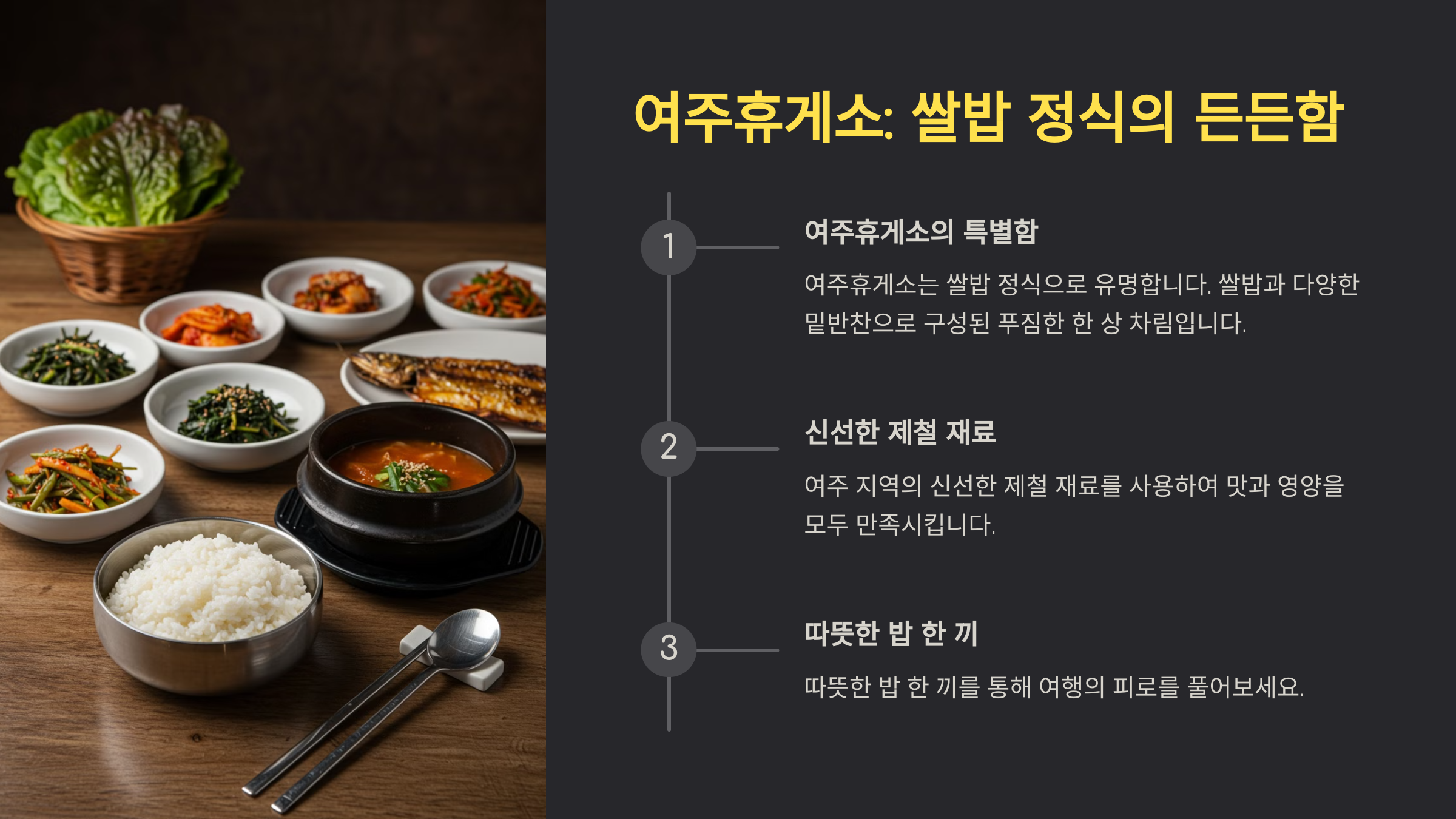 쌀로 유명한 여주답게 여주휴게소에서는 여주산 고품질 쌀로 만든 정식을 즐길 수 있습니다. 이 정식은 밥의 맛이 다른 곳과 비교할 수 없을 정도로 깊고 풍부하며, 함께 제공되는 반찬들도 신선하고 정갈합니다. 특히 고향의 맛을 느낄 수 있는 된장찌개와 보쌈은 많은 사람들이 재방문을 약속하게 만드는 맛입니다.