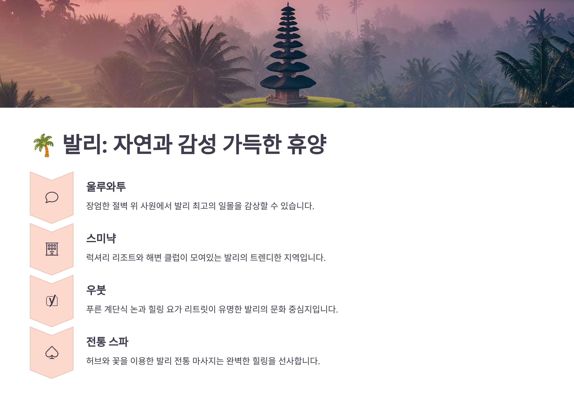 - 🧘 추천 코스: 우붓 요가, 원숭이 숲, 스미냑 선셋비치, 발리 스윙