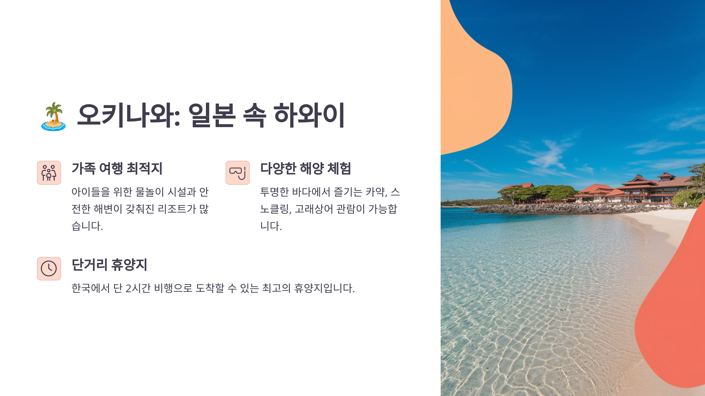 | 🇯🇵 오키나와 | 가까운 일본 휴양, 가족 리조트 천국 | 4~6월 | 60~90만 원 | 2시간 30분 | 3~4일 | 네이버 오키나와 |