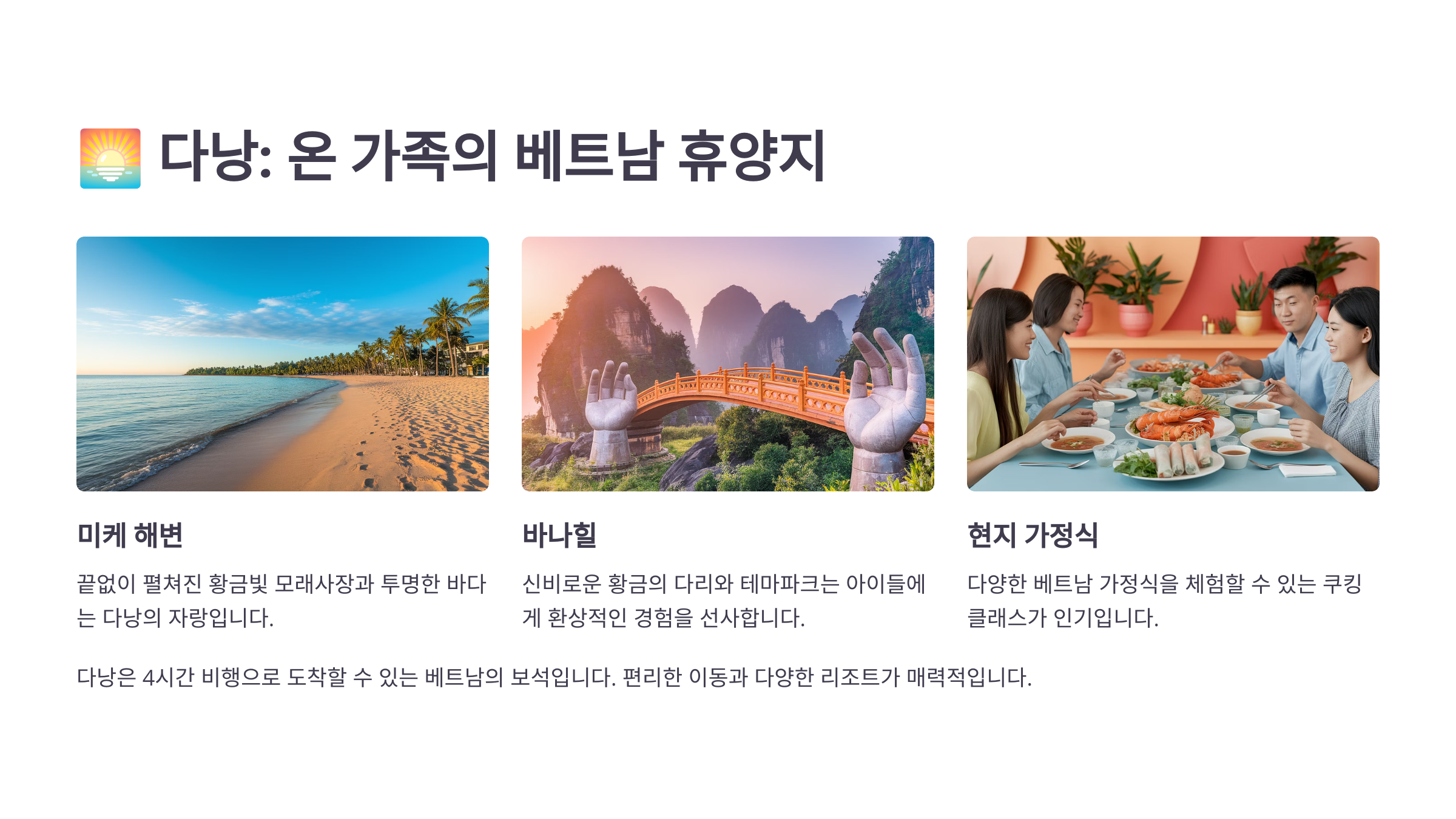 - ✈️ 항공: 인천→다낭 4시간 30분 / 저가항공 다수