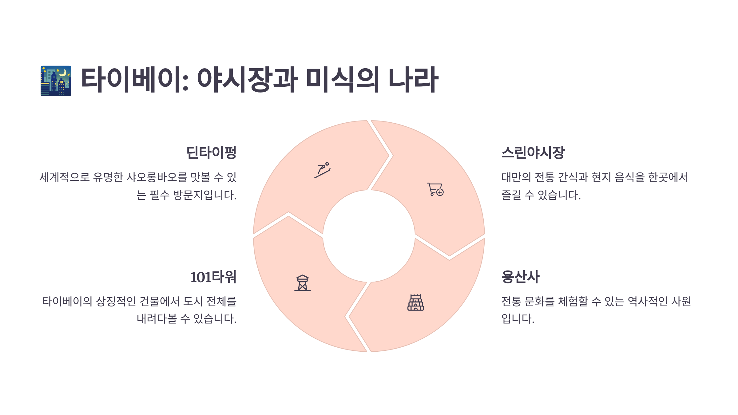 | 🇹🇼 타이베이 | 야시장, 온천, 자연+도시 조화 | 3~5월 | 60~80만 원 | 2시간 40분 | 3~4일 | Taiwan Tourism |