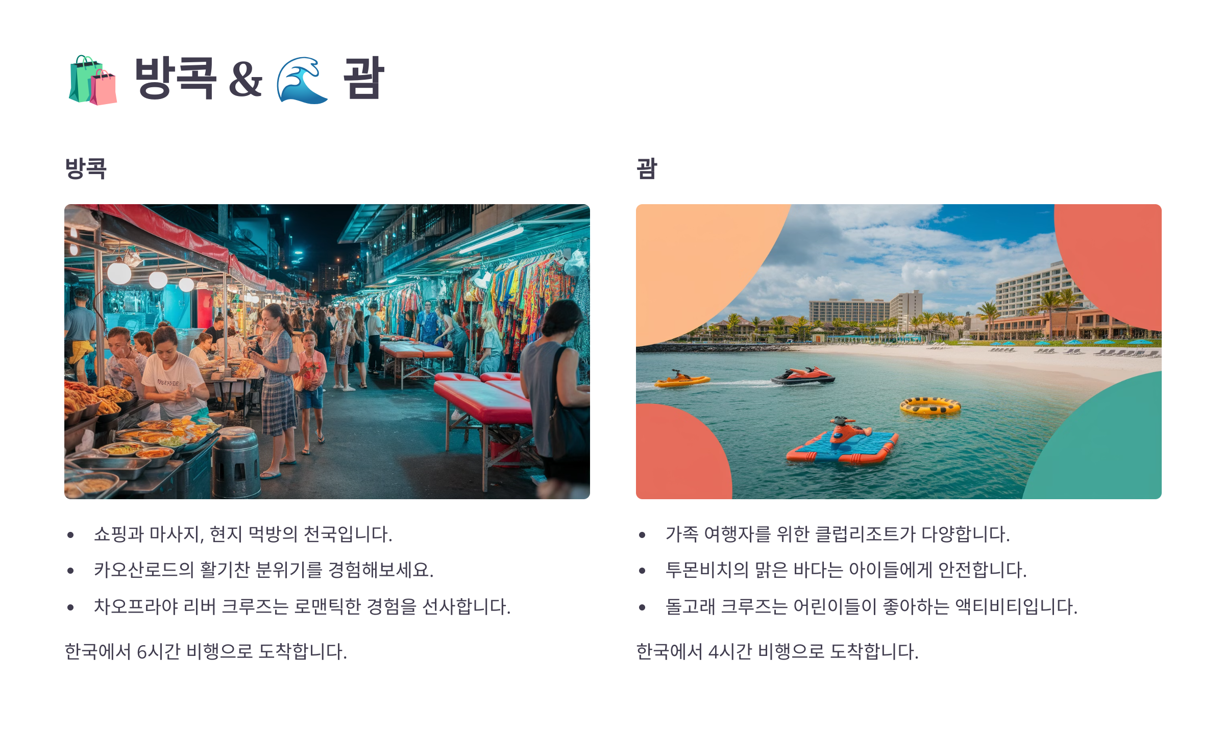 - ✈️ 항공: 인천 → 괌 약 4시간 30분 / 대한항공·제주항공 운항