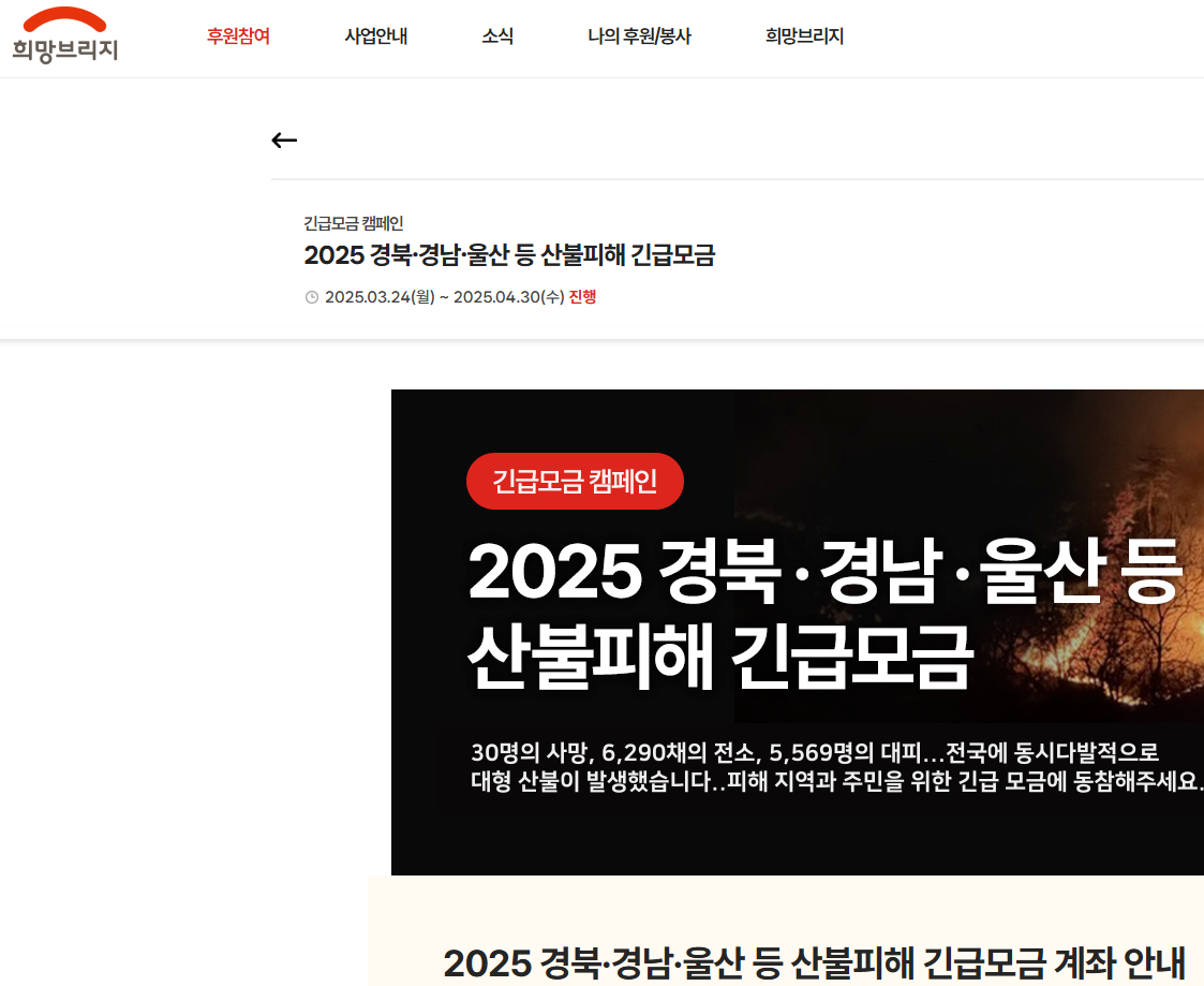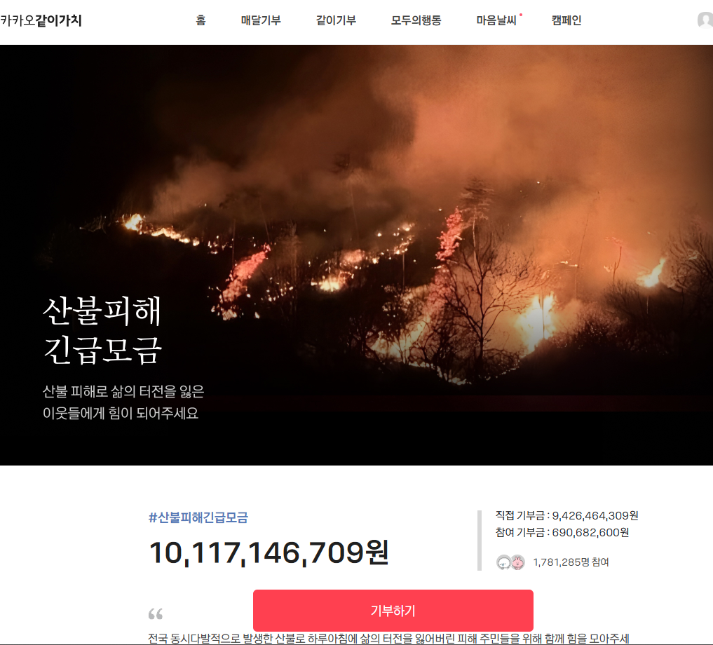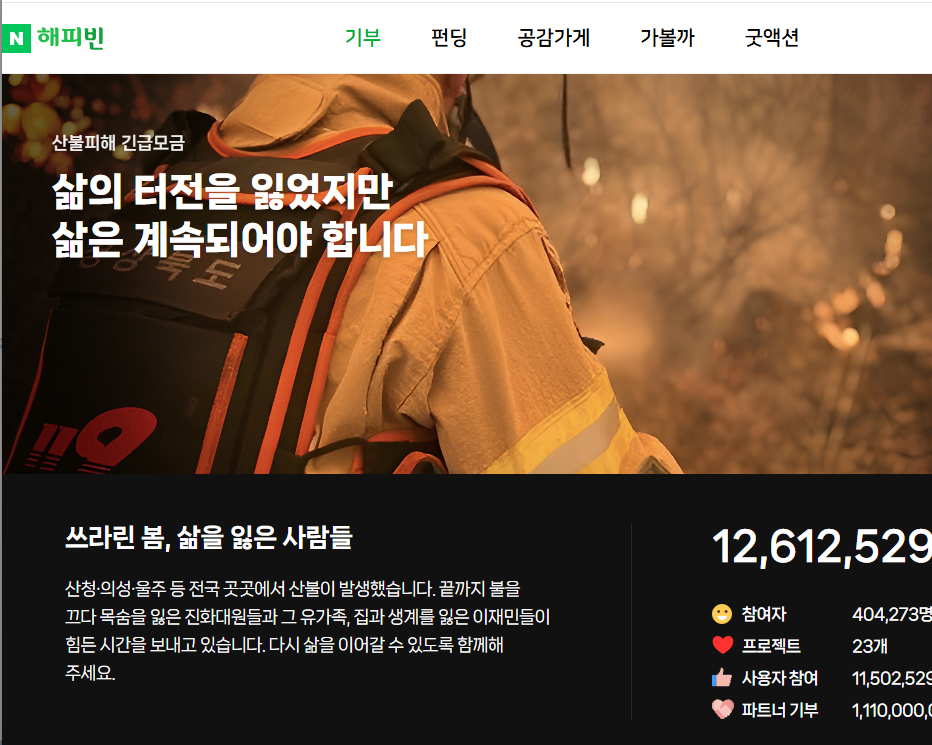 그 와중에도 하루하루 현장에서 불길을 잡는 소방관들, 따뜻한 도시락을 들고 달려간 자원봉사자들, 그리고 이들을 위해 기부에 나선 수많은 사람들 덕분에 우리는 다시 희망을 이야기할 수 있게 되었죠.