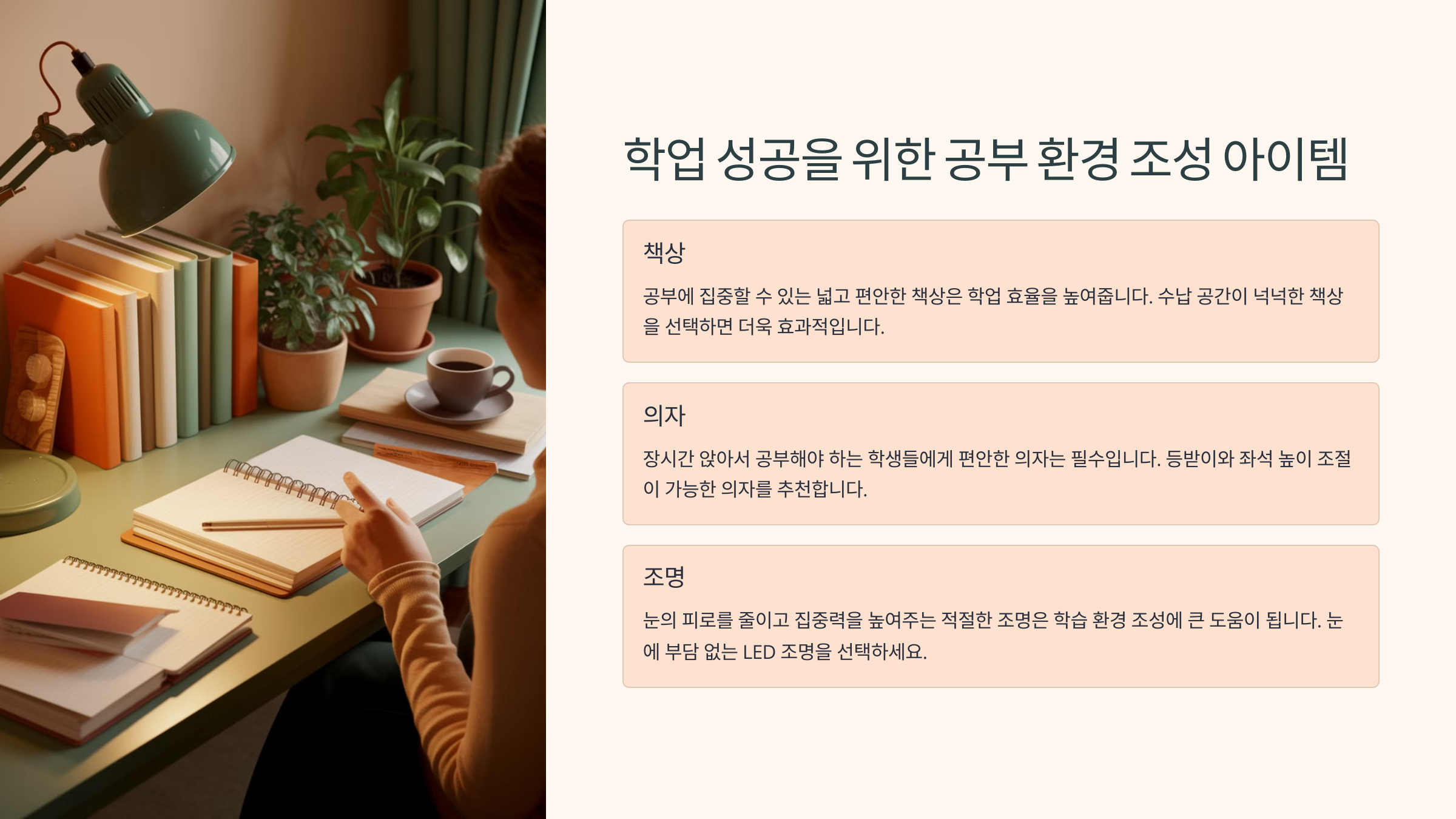 | LED 스탠드 | 눈 보호 기능, 밝기 조절 가능 | 야간 공부 필수템 |