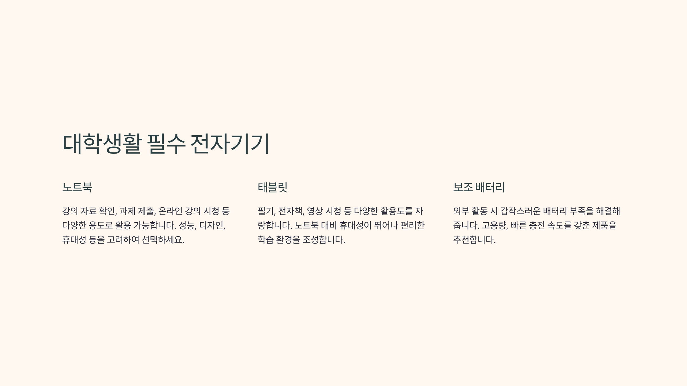 대학생활에서 전자기기는 필수예요! 수업을 듣거나 과제를 할 때, 효율적인 공부를 위해 꼭 필요한 아이템들이 있답니다. 노트북, 태블릿, 블루투스 이어폰 등 가성비 좋은 제품들을 추천해 줄게요. 🎧💻