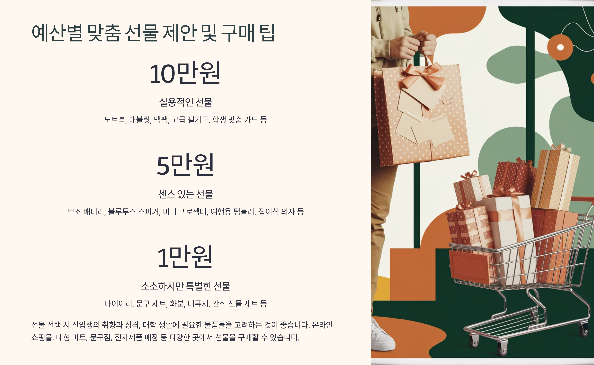 ✅ 신입생의 관심사 파악 – 받는 사람이 좋아할 만한 선물을 선택하면 더 의미 있는 선물이 될 거예요!