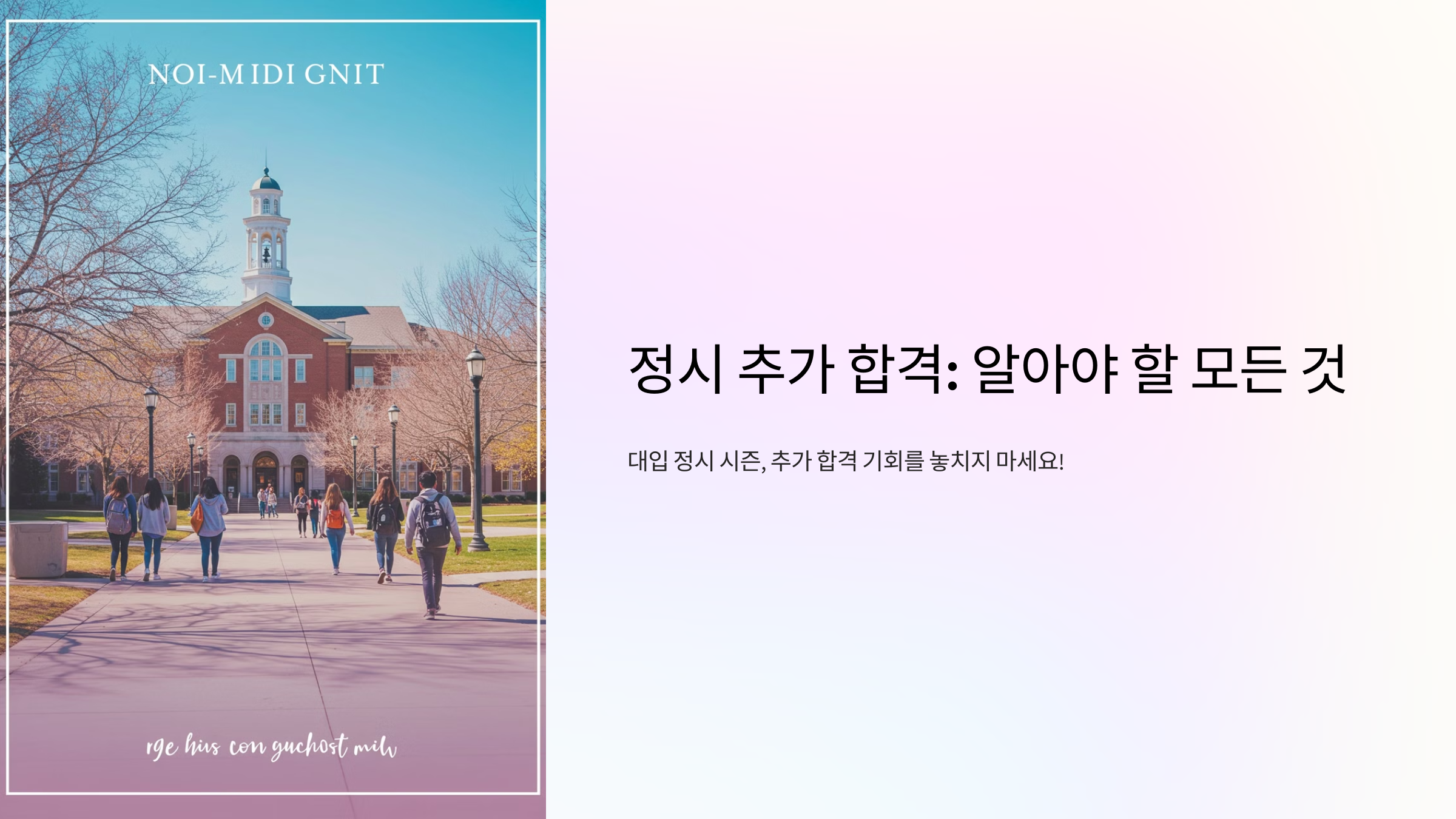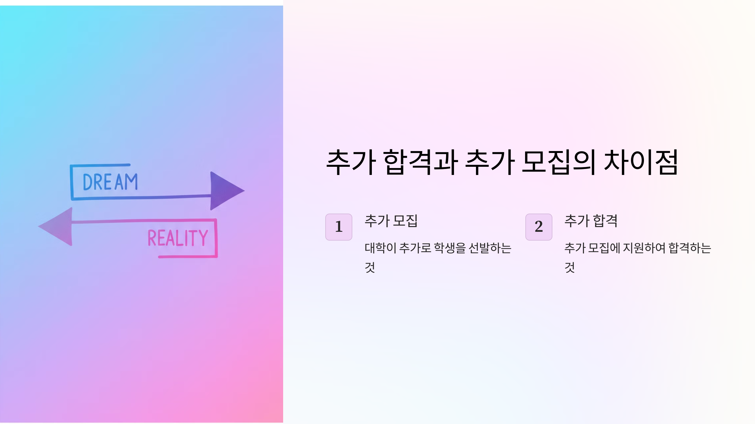 많은 수험생들이 정시 지원이 끝나면 기회가 끝났다고 생각하지만, 실제로는 추가 합격과 추가 모집을 통해 대학에 입학할 기회가 남아 있습니다. 추가 합격과 추가 모집의 차이를 정확히 알고 전략적으로 대응하면 합격 확률을 더욱 높일 수 있습니다.