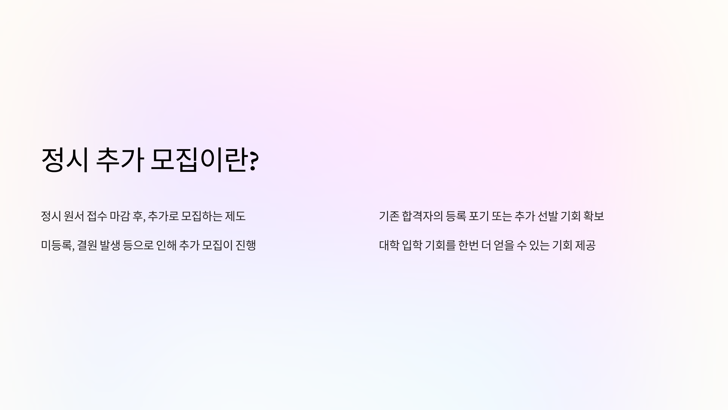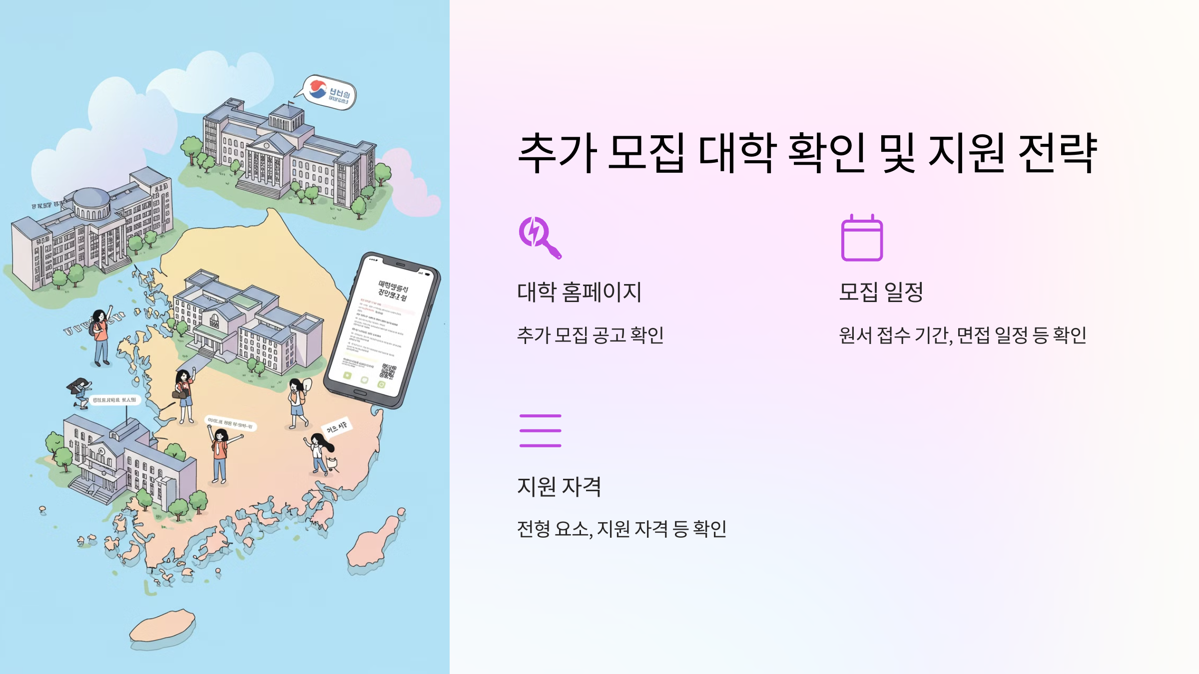 📌 추가 모집은 정시 지원 여부와 관계없이 새로운 지원을 받을 수 있는 기회이며, 대학별로 모집 인원과 일정이 다를 수 있습니다.