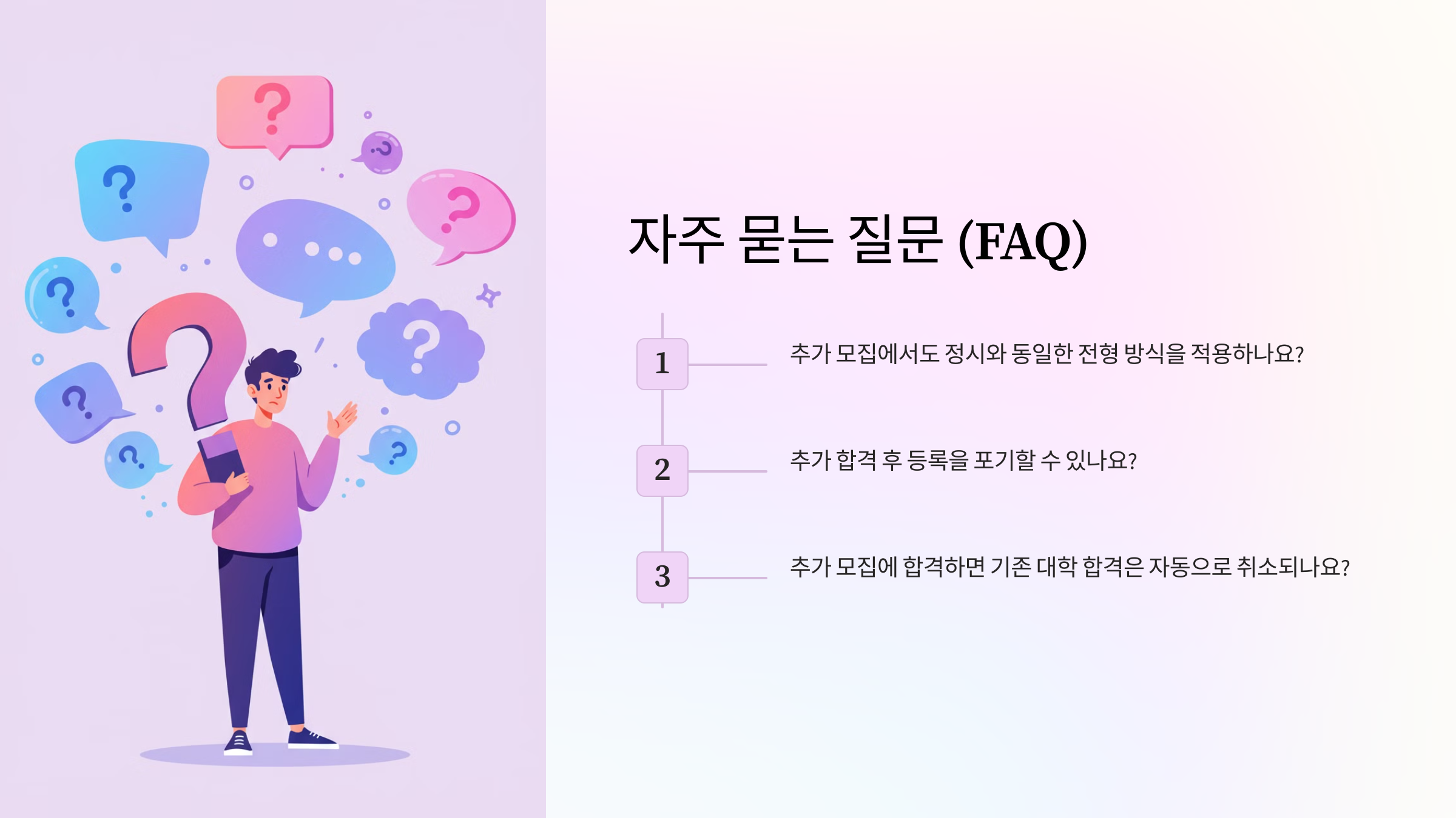 • 추가 합격 후 등록 마감 기간이 짧기 때문에, 등록금을 미리 준비해 두고 신속하게 대응하는 것이 중요합니다.