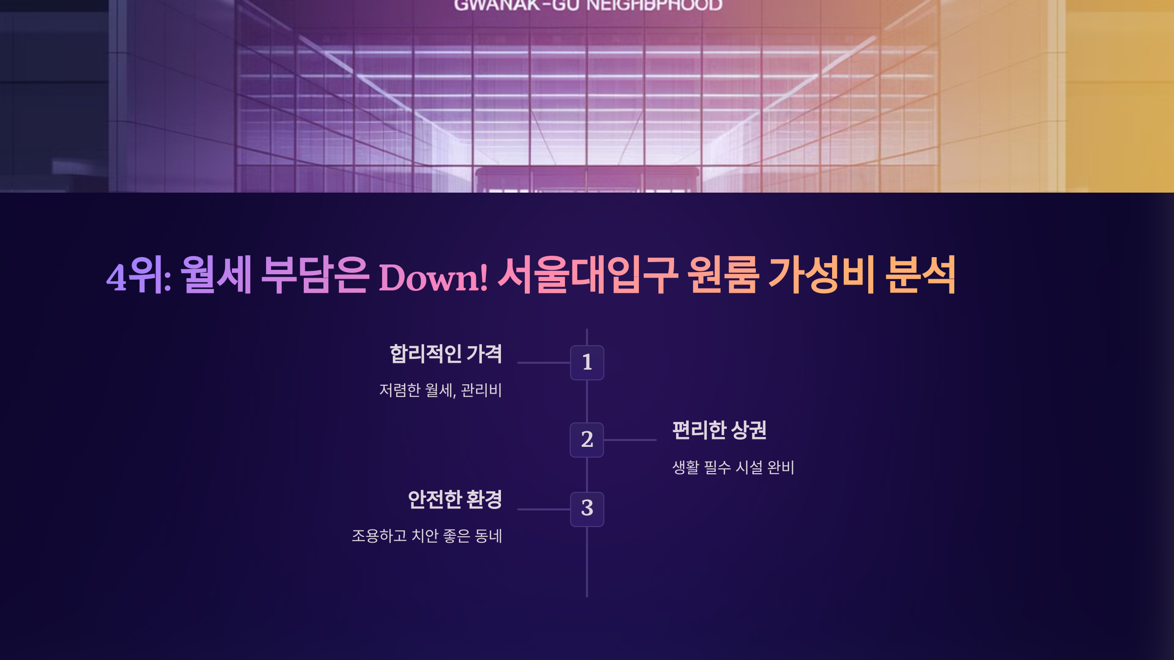 | 4위 | 서울대입구 | 대학가 분위기 + 저렴한 원룸 | 35~50만 원 |