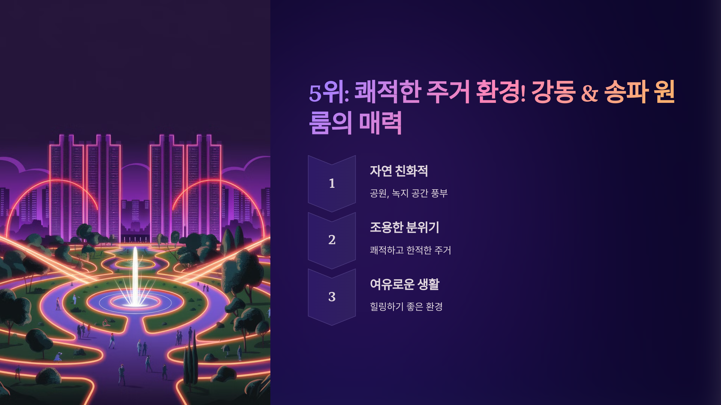 | 5위 | 강동 & 송파 | 조용하고 쾌적한 주거 환경 | 40~55만 원 |