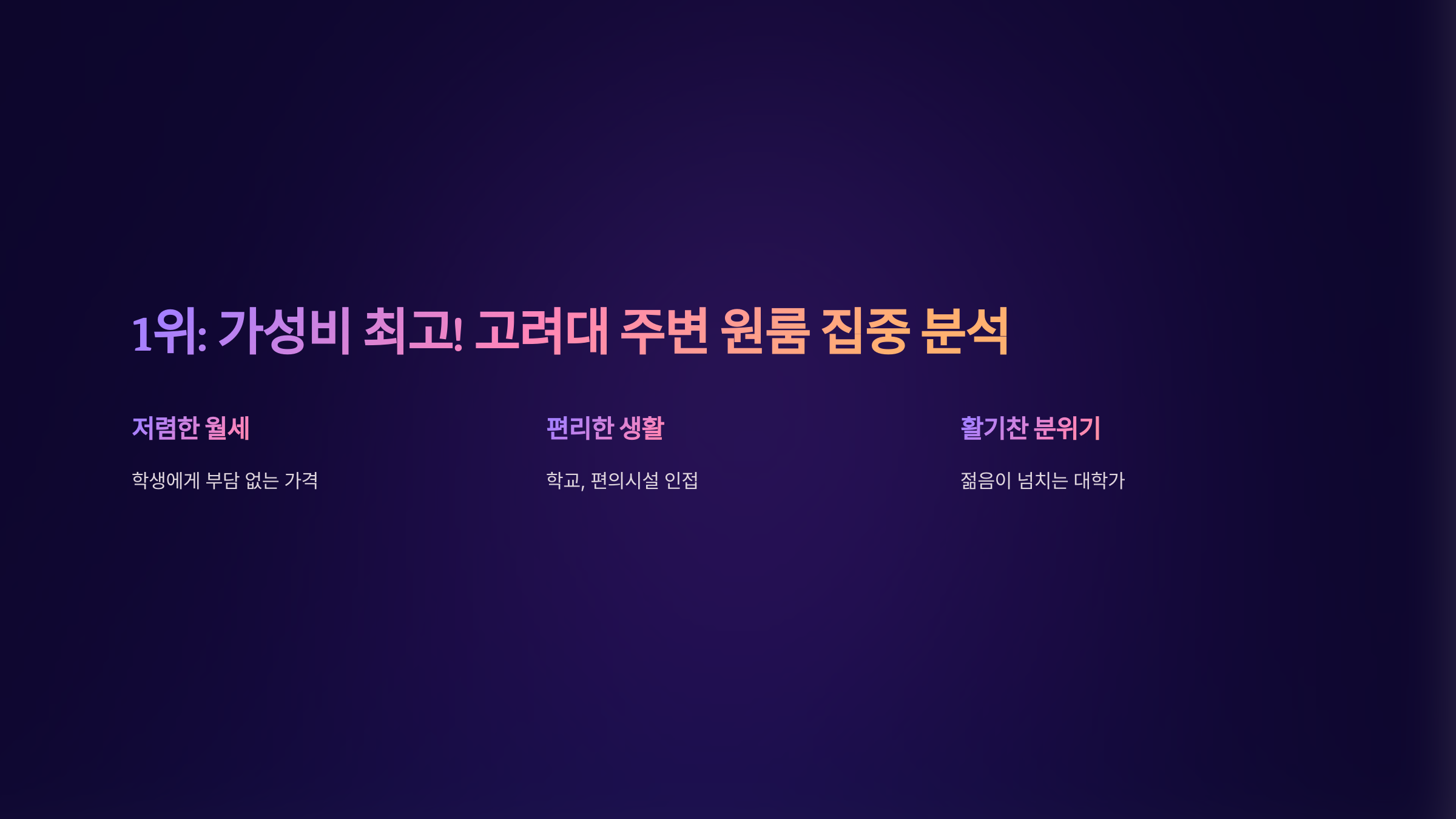 | 1위 | 고려대 주변 | 가성비 좋은 원룸 밀집 지역 | 40~50만 원 |