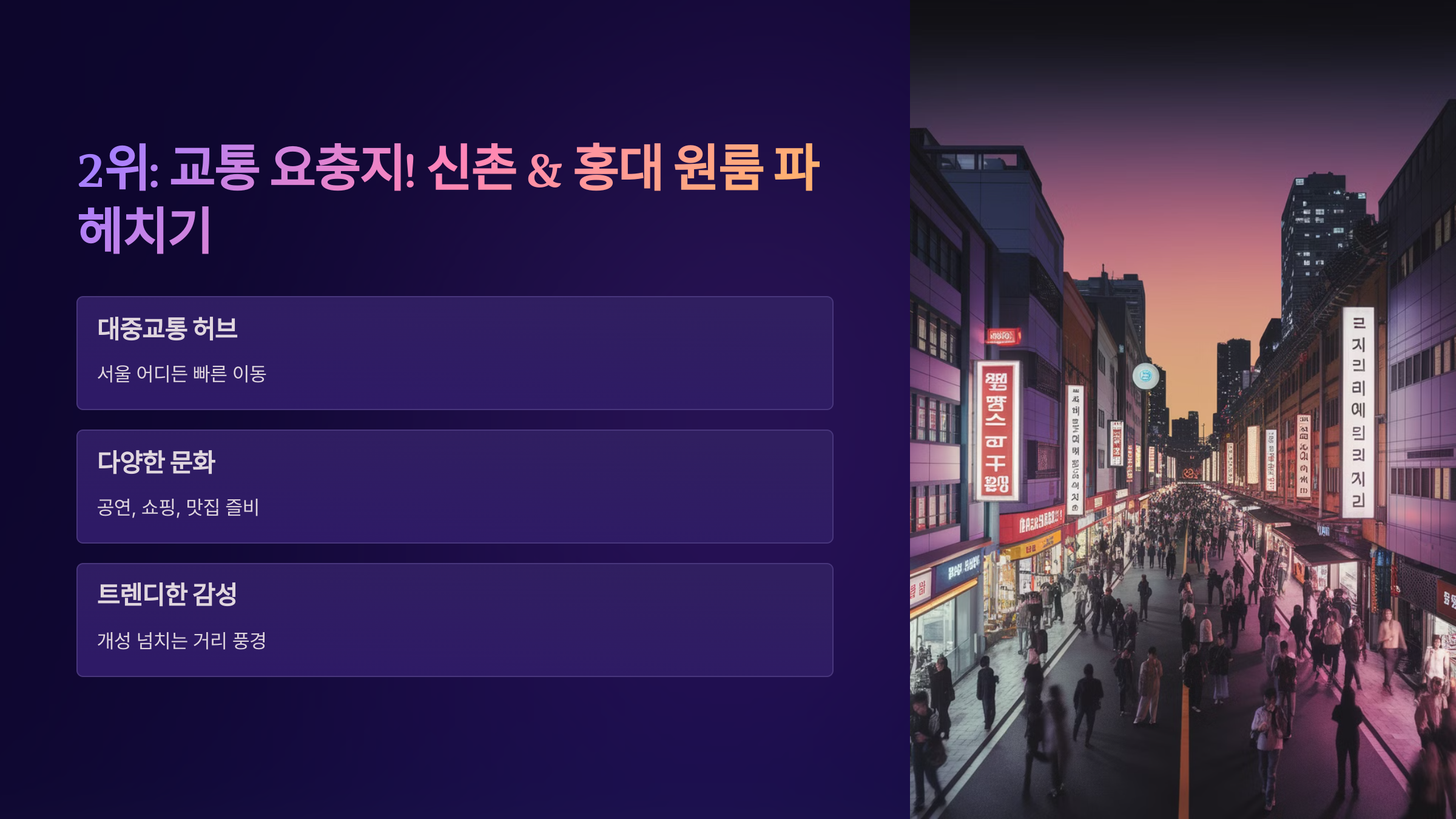 | 2위 | 신촌 & 홍대 | 교통 최강, 생활 편리 | 50~70만 원 |