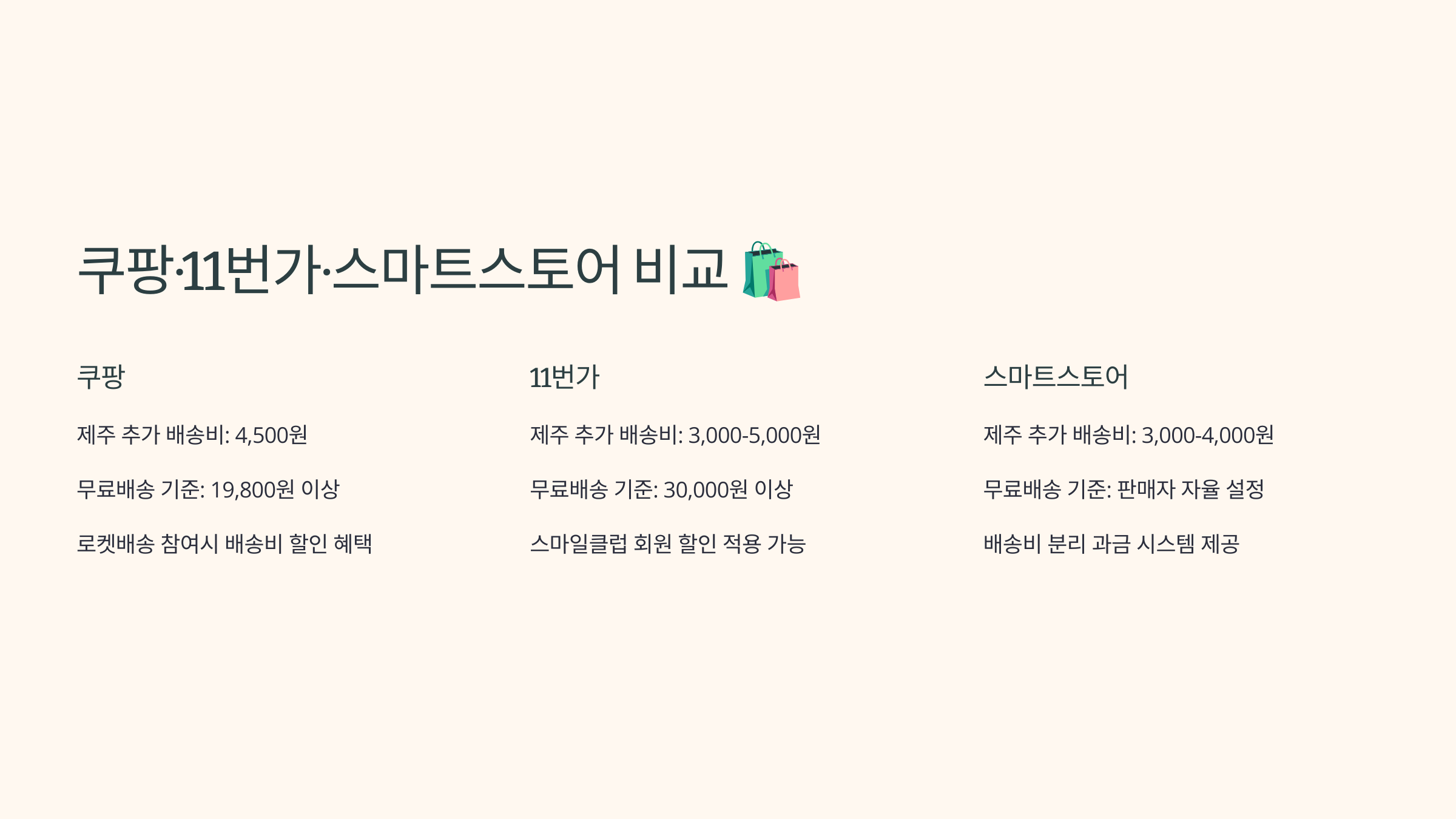 🛒 쿠팡, 스마트스토어, 11번가 등 주요 입점형 쇼핑몰들은 제주 추가 배송비 정책과 자동 설정 기준이 모두 다르기 때문에 판매자 입장에서 꼼꼼히 비교하고 설정해두는 게 매우 중요해요.