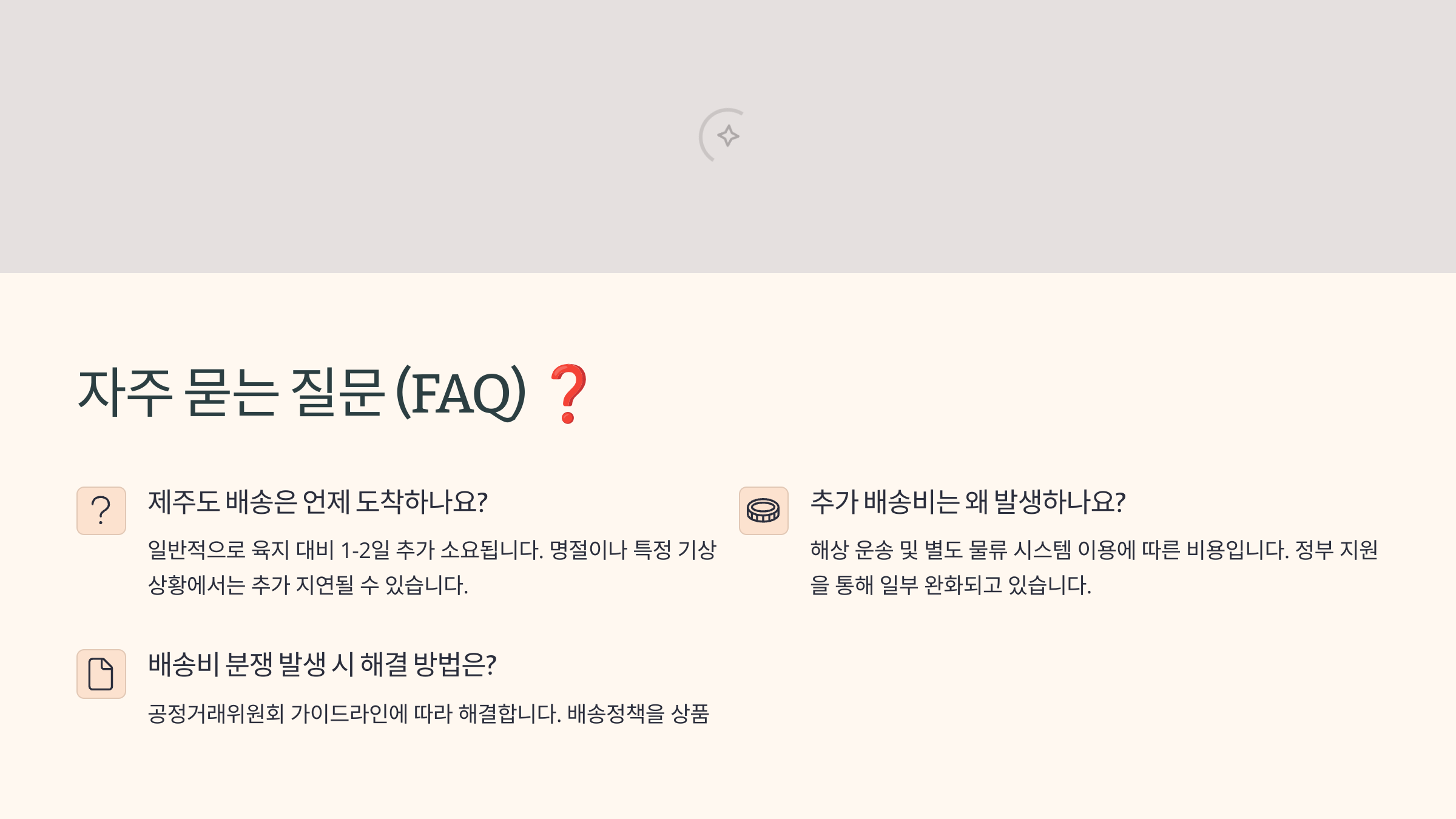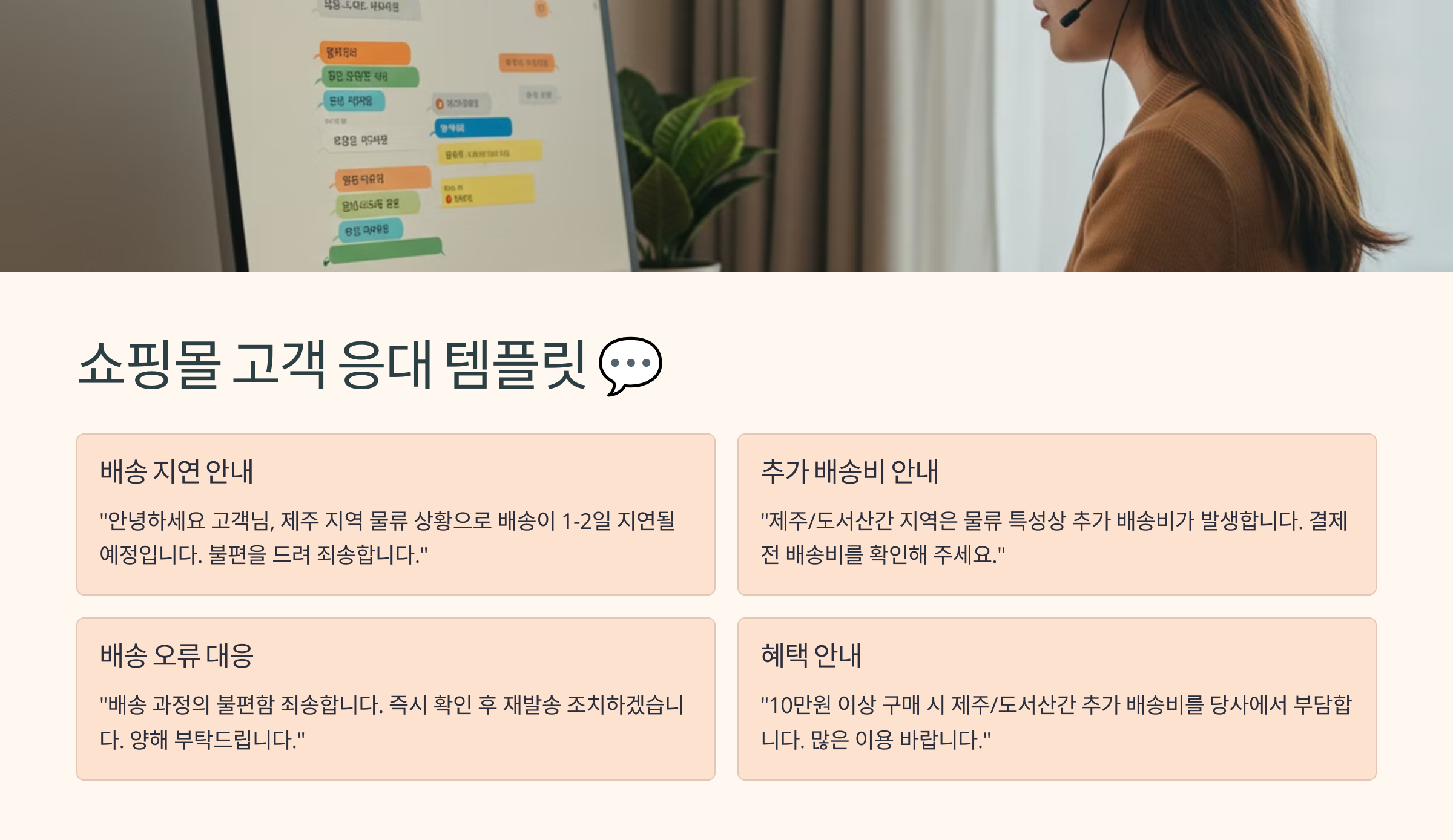 💬 제주도 고객 응대는 배송비, 배송일정, 반품 안내에서 민감할 수 있어요. 불필요한 오해를 줄이려면 표준화된 응대 문구를 사전에 준비해두는 게 좋아요.