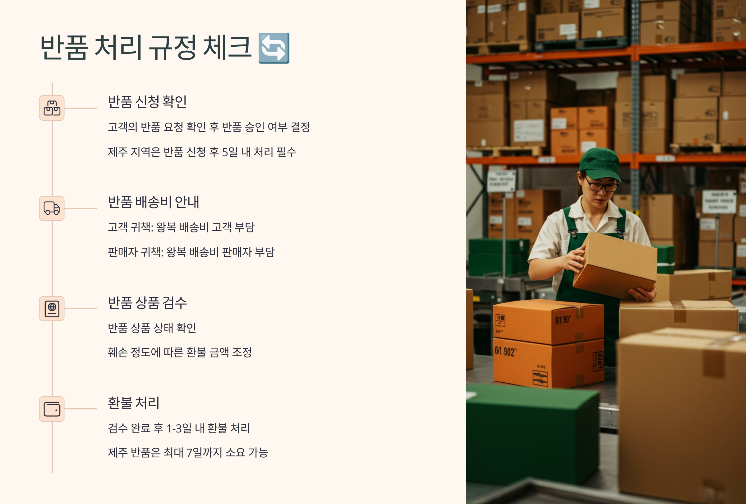 🔄 제주도는 도서산간 지역이라 기본 배송비보다 반품 비용이 더 높아요. 따라서 반품·교환 처리 시 추가 비용 발생 여부와 자동 차감 기준을 미리 이해하고 있어야 고객과의 분쟁을 줄일 수 있어요.