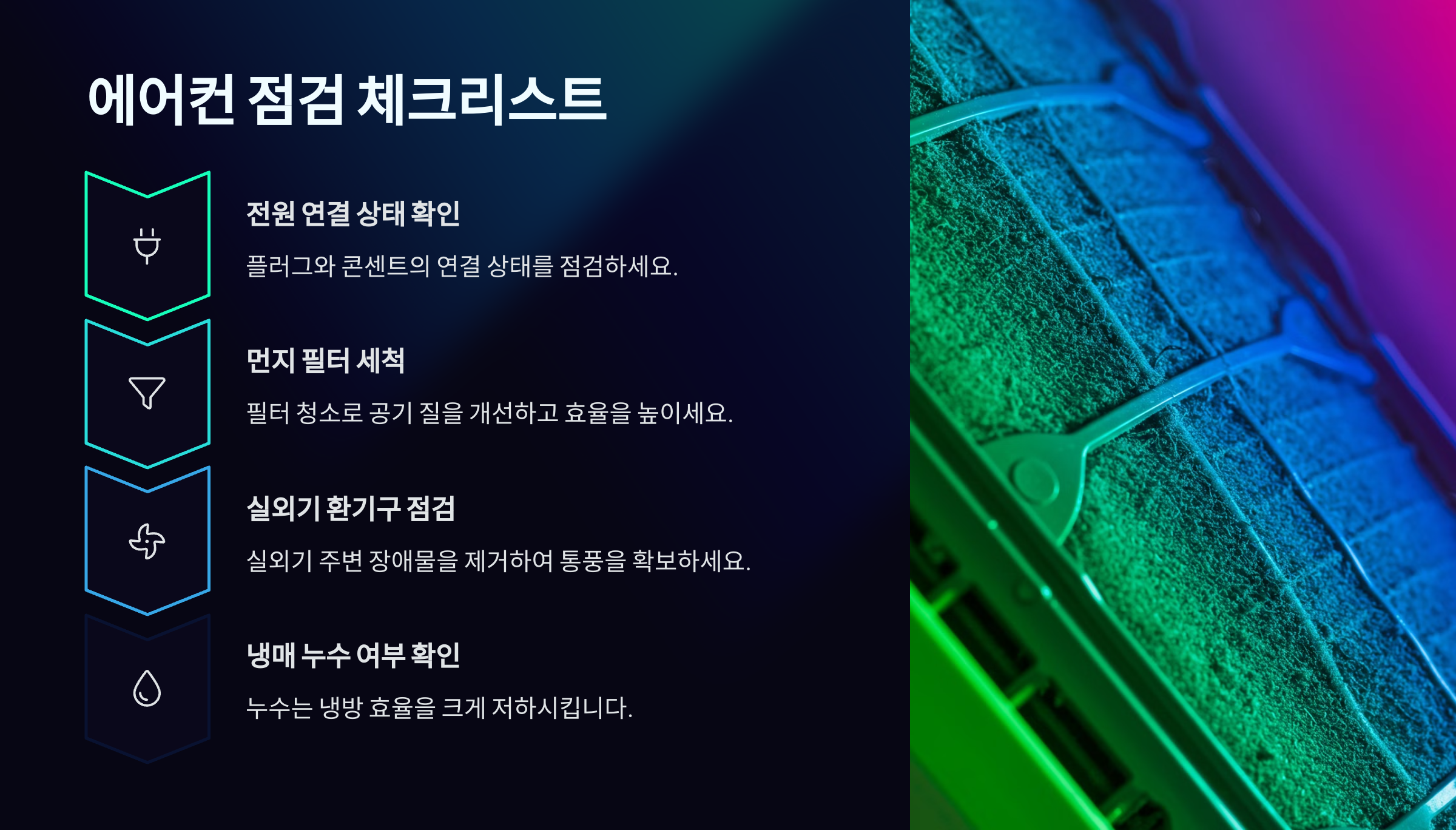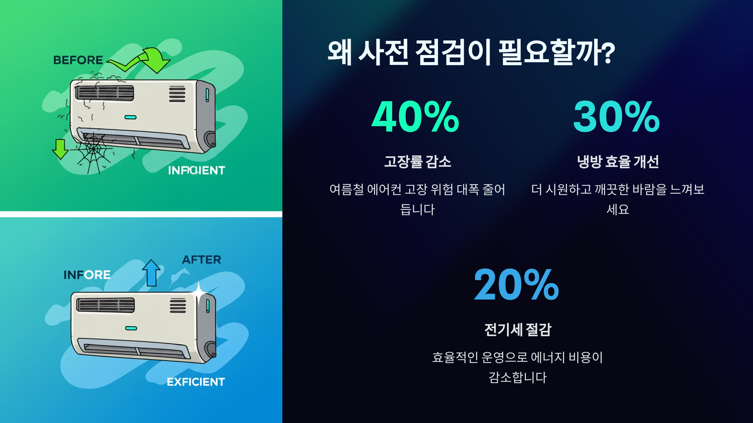 ✅ 사전 점검은 단순히 '작동 여부'만 확인하는 게 아니라 에너지 절약 + 수명 연장 + 고장 예방까지 챙길 수 있는 필수 관리 루틴이에요. 특히 실외기 상태는 꼭 점검 받아야 해요!