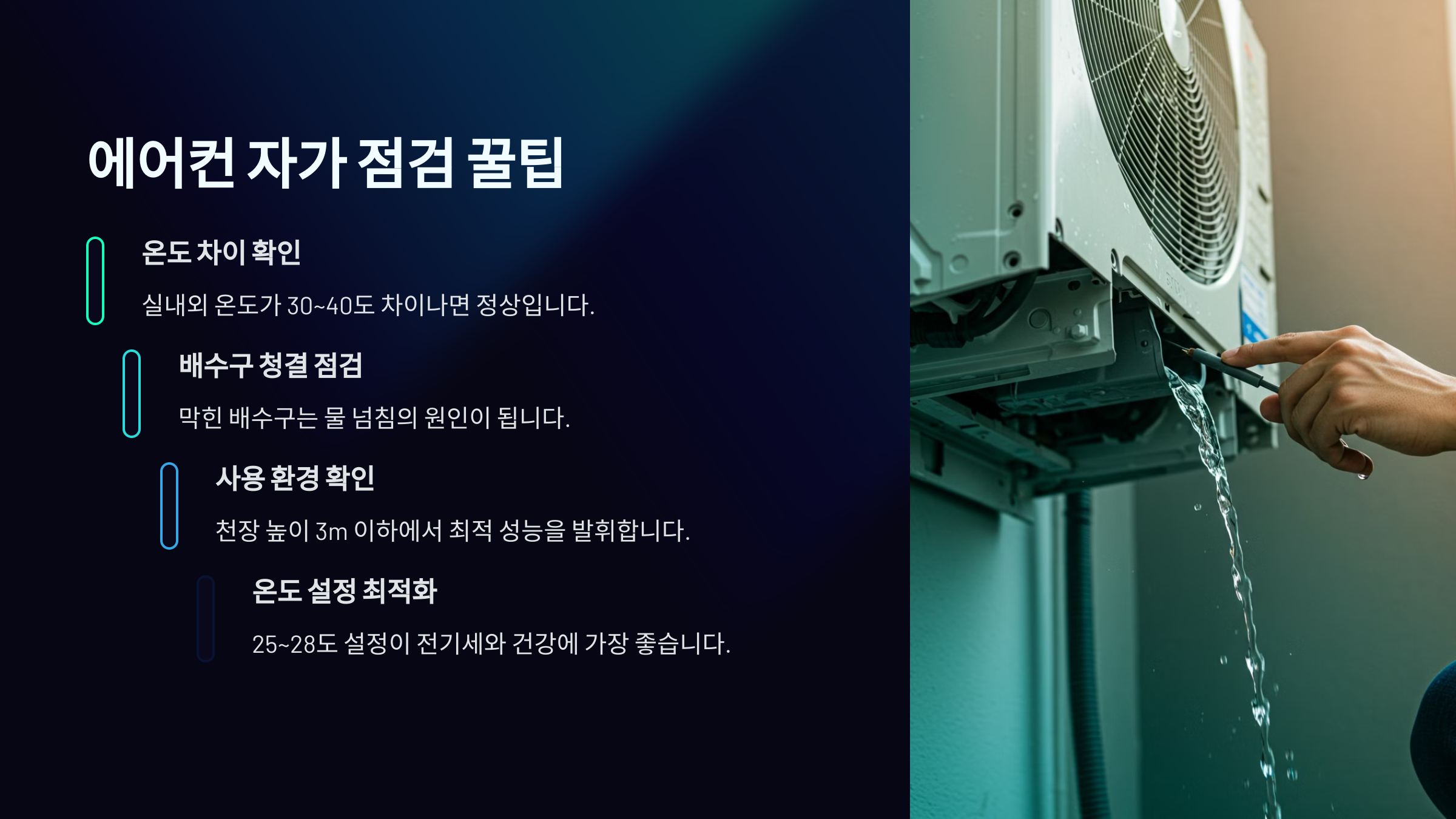 📌 이 항목들 중 하나라도 이상이 있으면 전문 기사 방문을 통해 무상 또는 유상 점검을 받는 걸 추천해요. 특히 실외기는 직접 접근이 어렵기 때문에 꼭 전문가 점검이 필요할 수 있어요.
