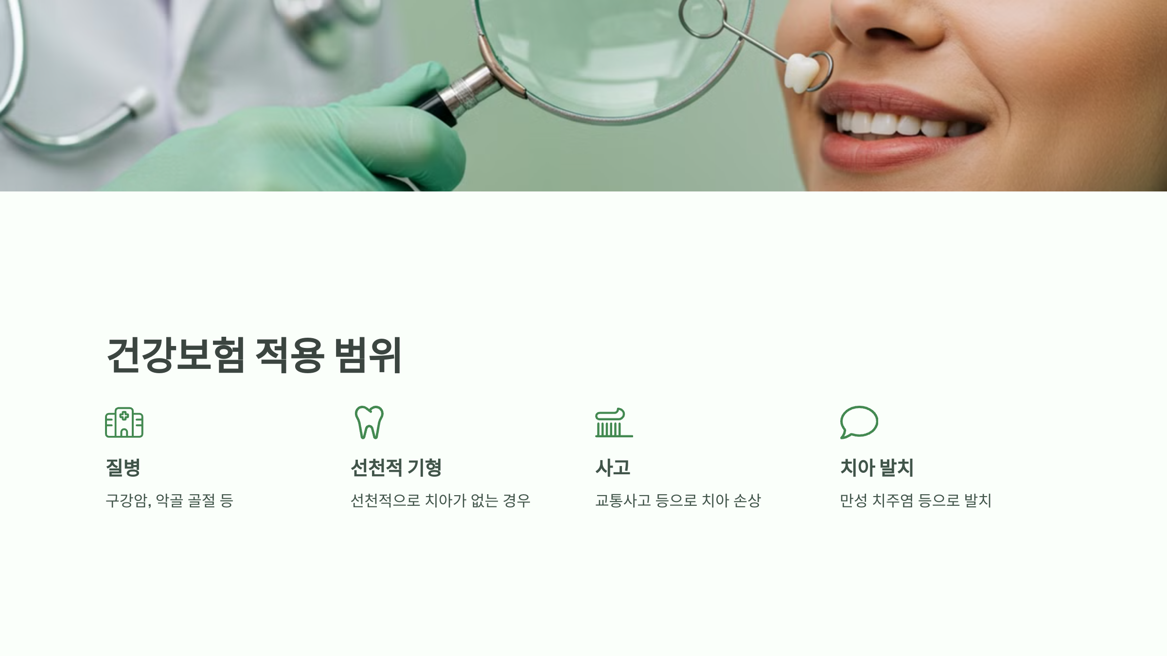 보장 내용 | 치료 목적의 의료비 일부 보장 | 임플란트, 틀니, 브릿지 등 치과 치료 보장 |
