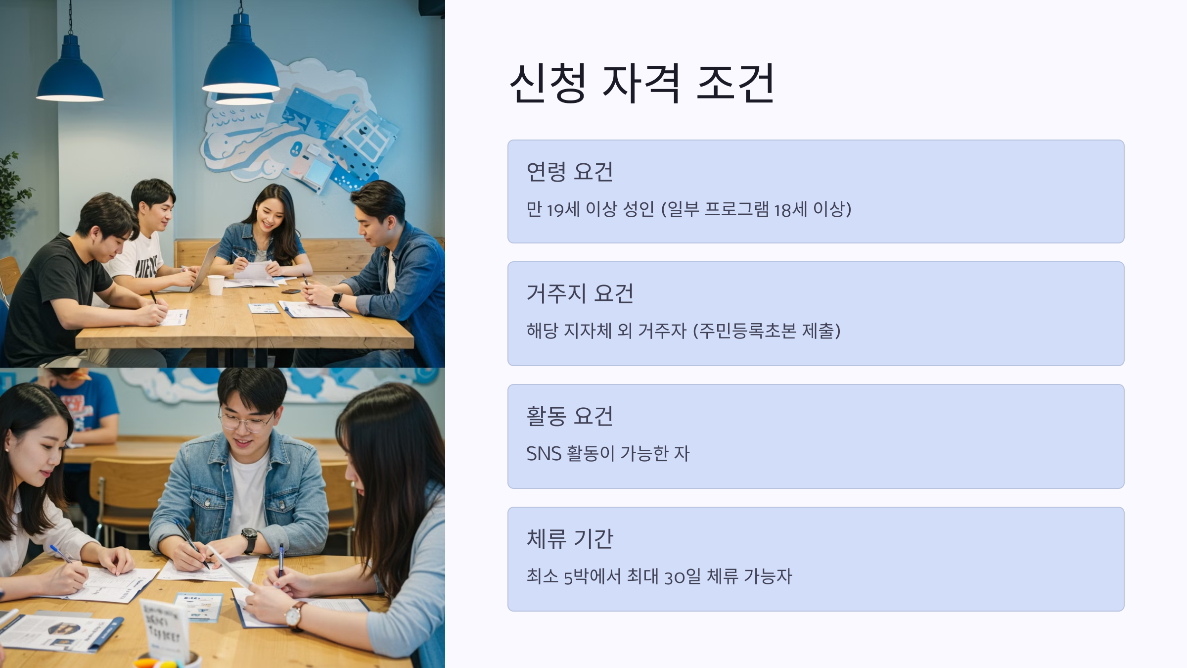 가장 좋은 점은, 생각보다 신청 조건이 까다롭지 않다는 것이에요! 만 19세 이상 청년, 원격 근무자, 여행 크리에이터 등 다양한 대상이 있고, 지역 주민 등록이 없어도 외부인도 신청 가능한 곳이 많아요 🙌