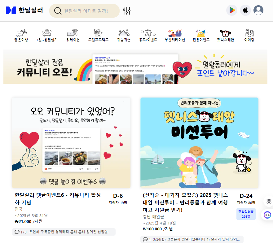 한달살기, 일주일살기, 워케이션 지원 프로그램이 모두 여기에! 3만원부터 150만원까지 다양한 여행 지원 프로그램을 한달살러에서 만나세요. 한달살기 비용도 줄이고, 생각지 못한 낯선곳으로