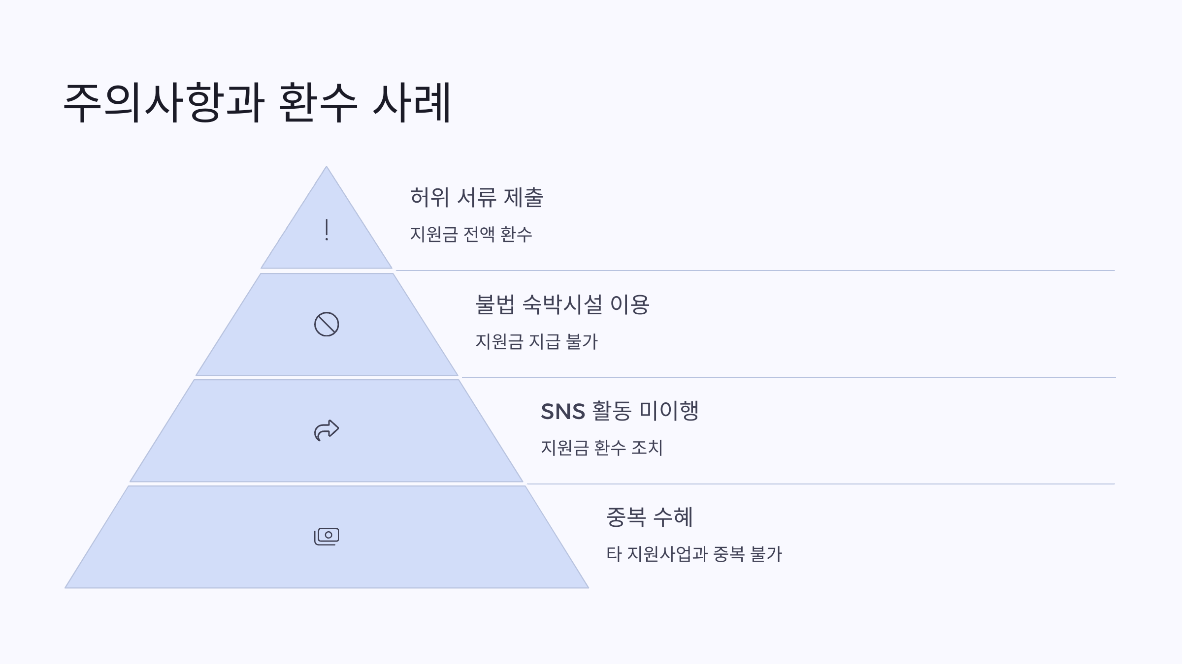 특히 다음과 같은 상황은 환수 또는 불이익 사유가 될 수 있으니 꼭 주의해주세요.