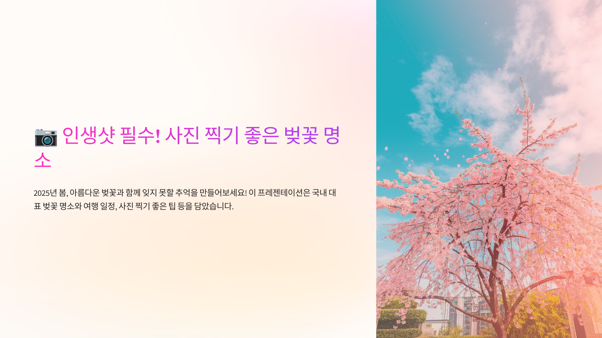 벚꽃 시즌에는 어디서 찍어도 아름다운 사진이 나오지만, 특정 명소에서는 더욱 환상적인 인생샷을 남길 수 있어요! 전국에서 가장 사진 찍기 좋은 벚꽃 명소를 소개할게요. 📸🌸