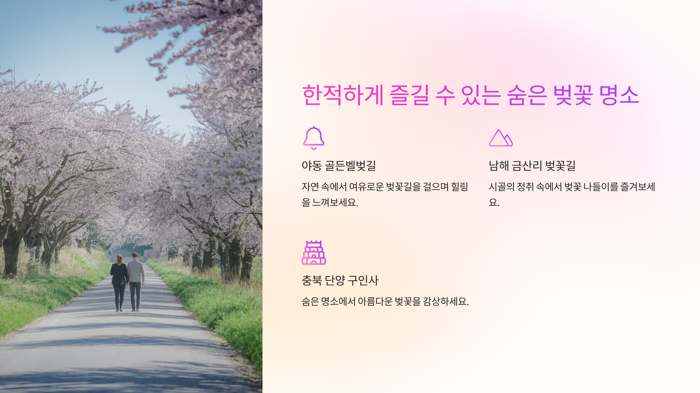북적이는 인파를 피해 조용하고 여유로운 벚꽃 여행을 떠나보세요! 🌸💖