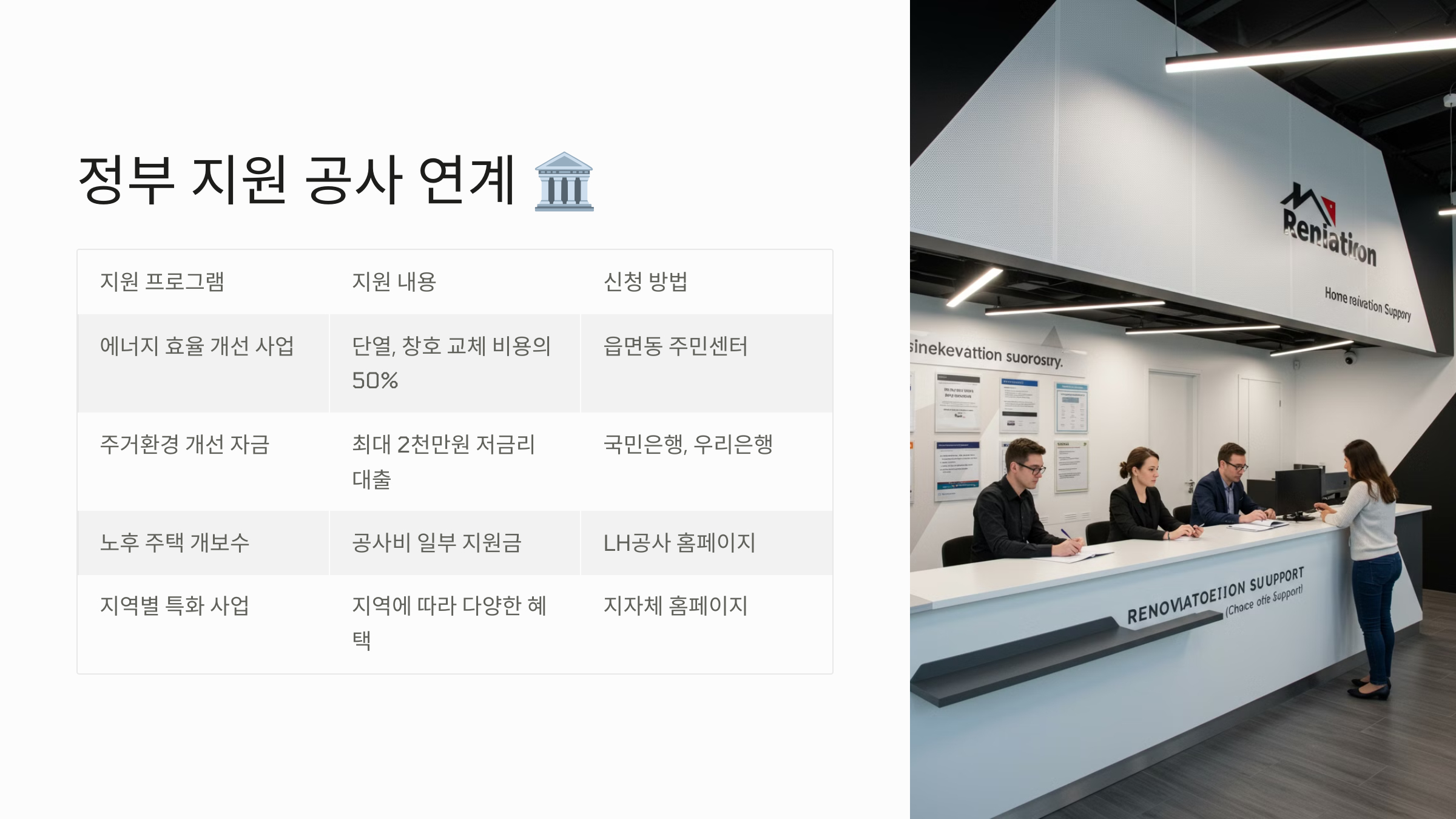 | LH 노후주택 리모델링 지원 | 설비 교체, 내외부 리폼 비용 일부 보조 | LH 임대주택 입주민 |