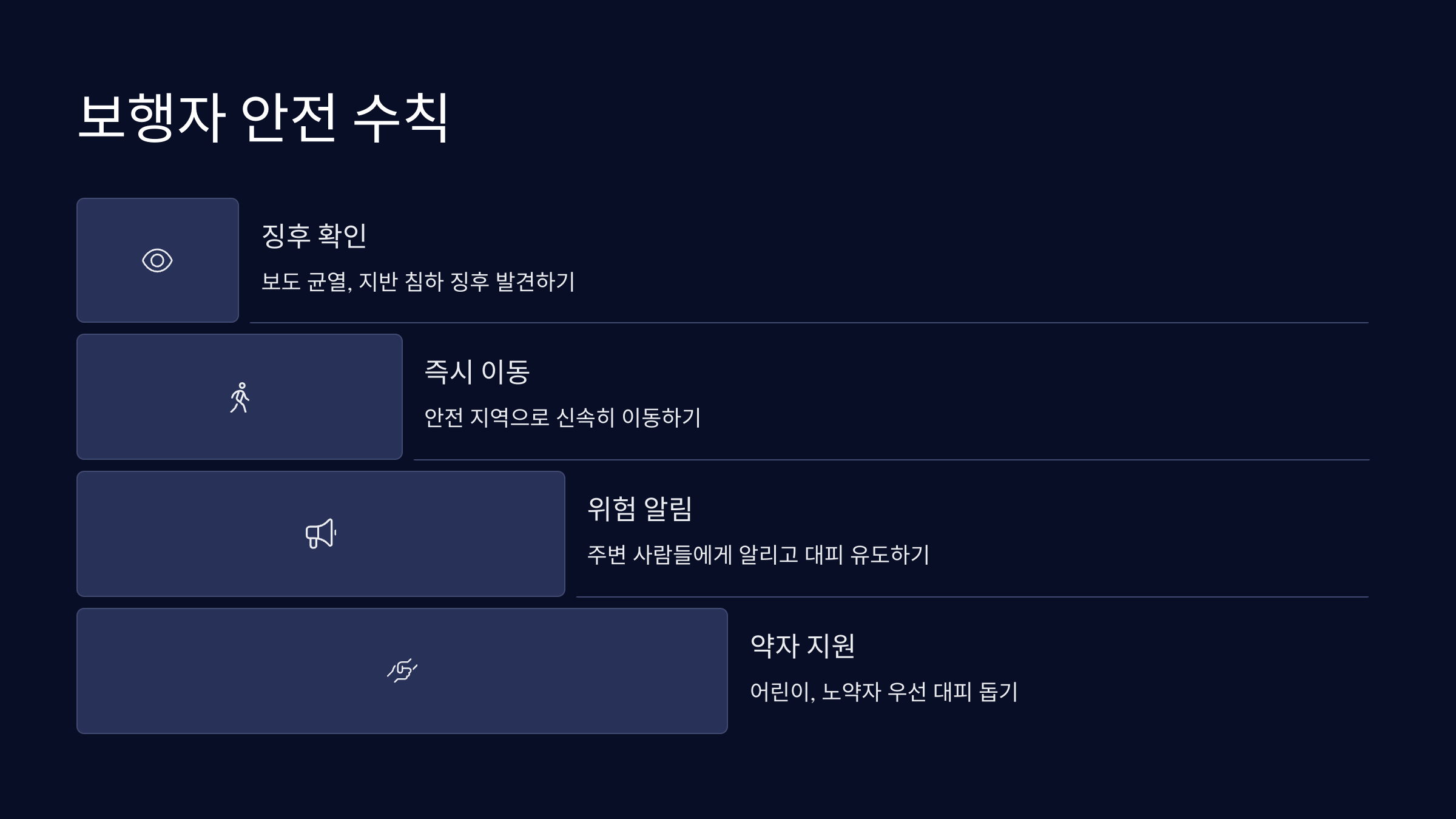 1. 현장 소방/경찰/공무원의 통제에 따르기 혼란한 상황일수록 개인 행동은 금물이에요. 구조대원이나 지자체 직원의 유도에 따라 질서 있게 이동하는 것이 가장 중요해요.