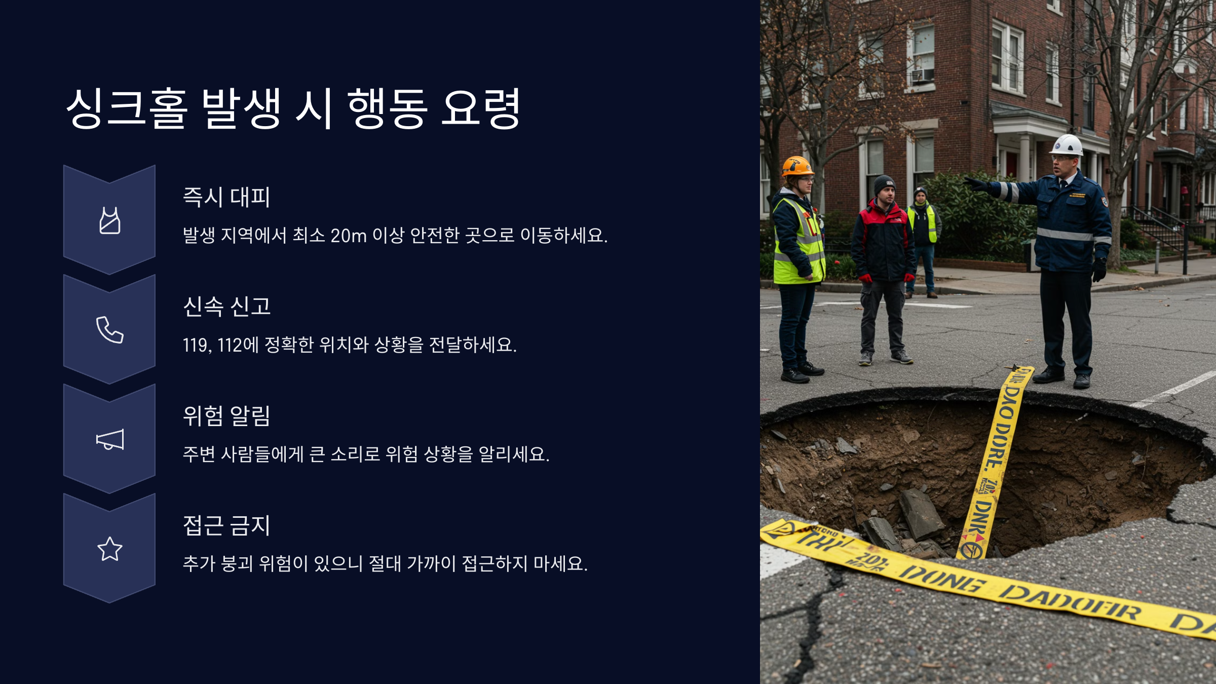 싱크홀은 예고 없이 발생하기 때문에, 현장에서의 즉각적인 대처가 매우 중요해요. 일반 도로, 주택가, 공사장 등 어디서든 생길 수 있기 때문에 평소에도 경계심을 갖는 습관이 필요하답니다.