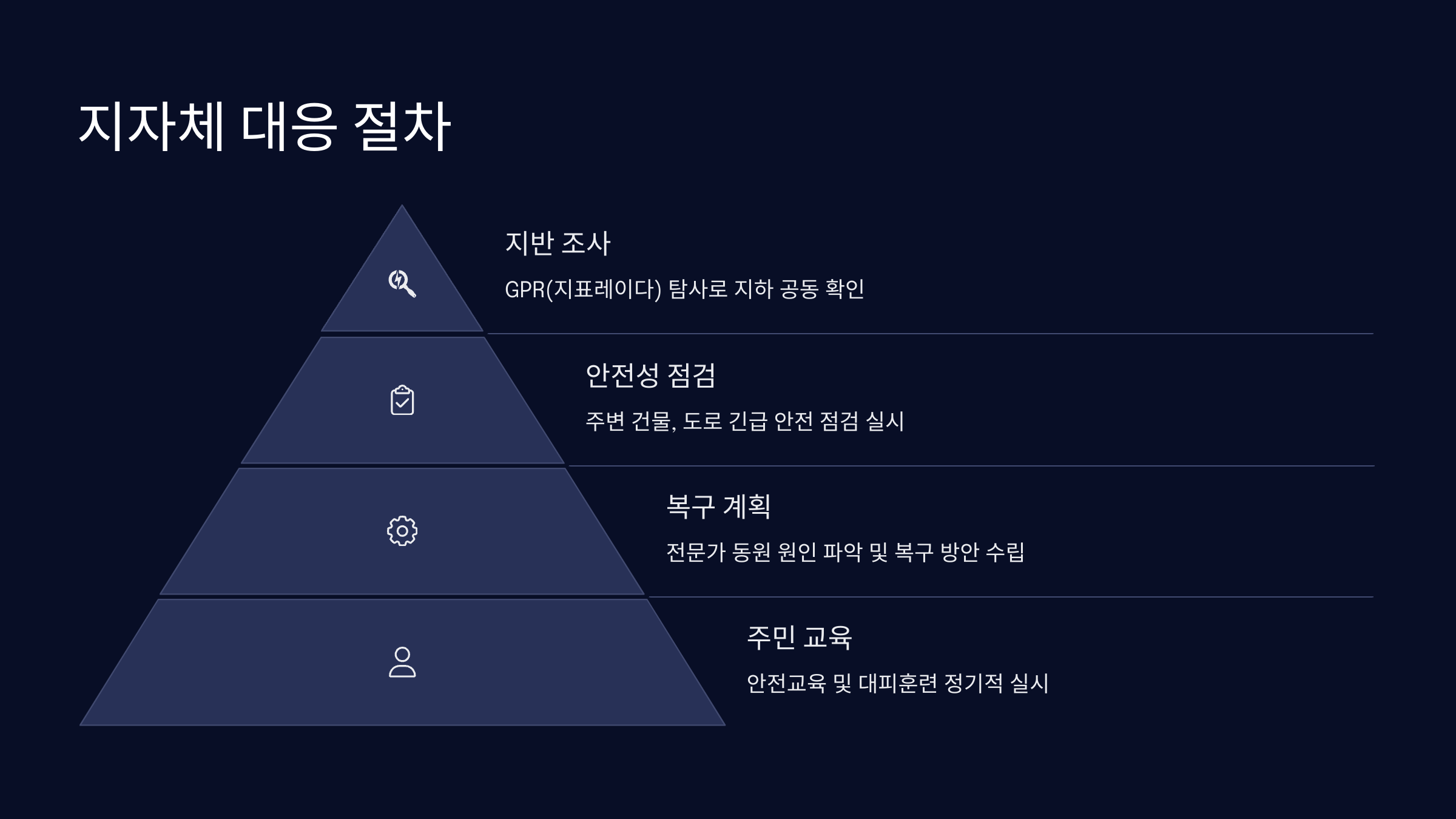 싱크홀은 자연 재해로 분류되기도 하지만, 대부분은 도시 기반 시설의 문제로 발생해요. 그렇기 때문에 지자체의 빠른 판단과 행동이 매우 중요해요. 일반 시민이 신고하면, 지자체는 즉시 현장 확인 → 전문가 점검 → 복구 절차를 시작하게 돼요.