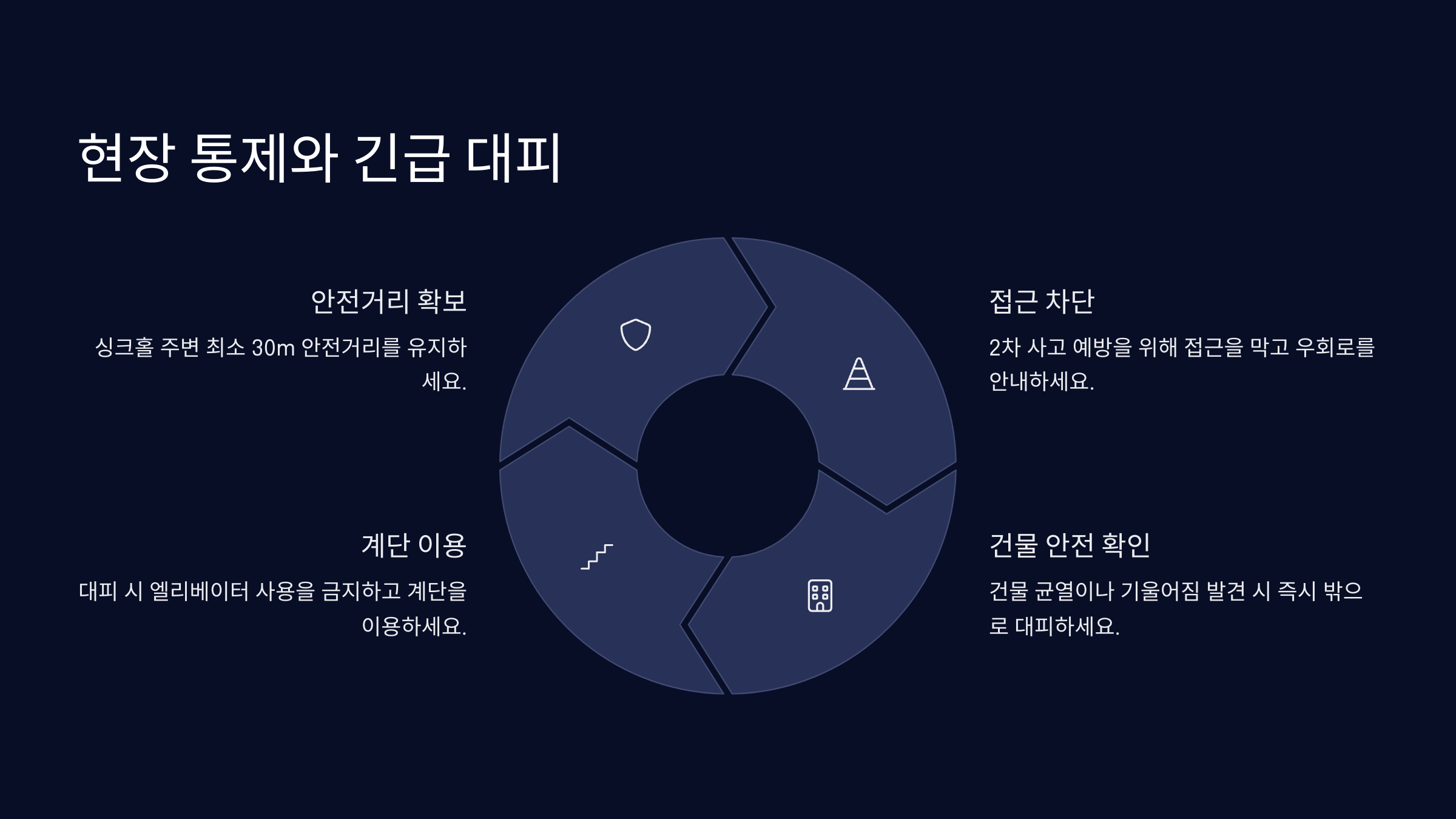 싱크홀은 예고 없이 발생하기 때문에, 현장에서의 즉각적인 대처가 매우 중요해요. 일반 도로, 주택가, 공사장 등 어디서든 생길 수 있기 때문에 평소에도 경계심을 갖는 습관이 필요하답니다.