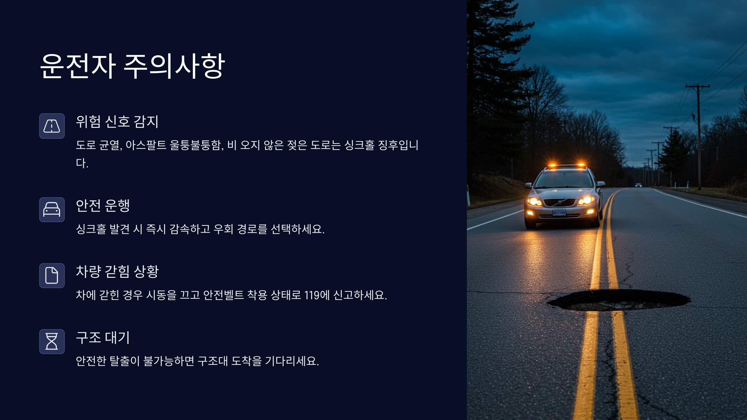 도로 위 운전자에게 싱크홀은 가장 치명적인 재난 중 하나예요. 특히 고속 주행 중이거나 야간, 우천 시엔 시야 확보가 어렵고 반응 시간이 짧기 때문에 더 큰 사고로 이어질 수 있어요.